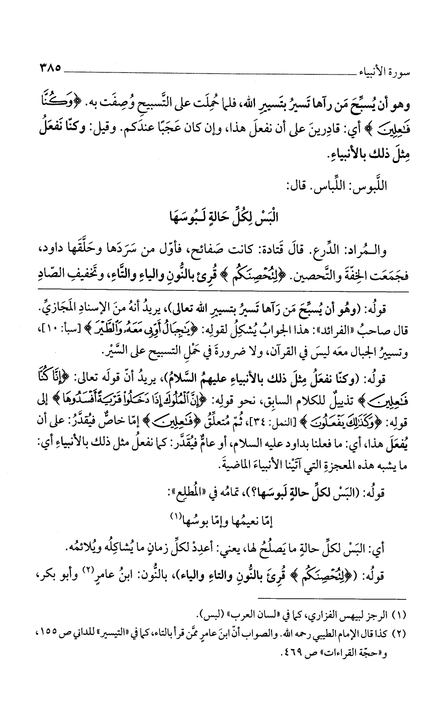 قوله: ((لِتُحْصِنَكُمْ) قرئ بالنون والتاء والياء)، بالنون: ابن عامرٍ وأبو بكر،