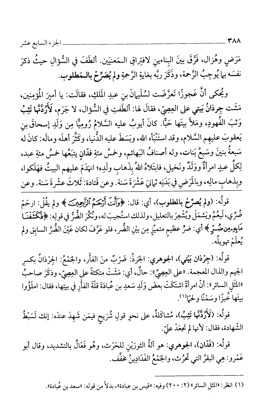 ويحكى أنّ عجوزا تعرضت لسليمان بن عبد الملك فقالت: يا أمير المؤمنين، مشت جرذان بيتي على العصىّ! فقال لها: ألطفت في السؤال، لا جرم لأردنها تثب وثب الفهود وملأ بيتها حبا. كان أيوب عليه السلام روميا من ولد إسحاق بن يعقوب عليهم السلام، وقد استنبأه الله وبسط عليه الدنيا وكثر أهله وماله: كان له سبعة بنين وسبع بنات، وله أصناف البهائم، وخمس مئة فدان «1» يتبعها خمس مائة عبد، لكل عبد امرأة وولد ونخيل، فابتلاه الله بذهاب ولده - انهدم عليهم البيت فهلكوا - وبذهاب ماله، وبالمرض في بدنه ثماني عشرة سنة. وعن قتادة: ثلاث عشرة سنة. وعن