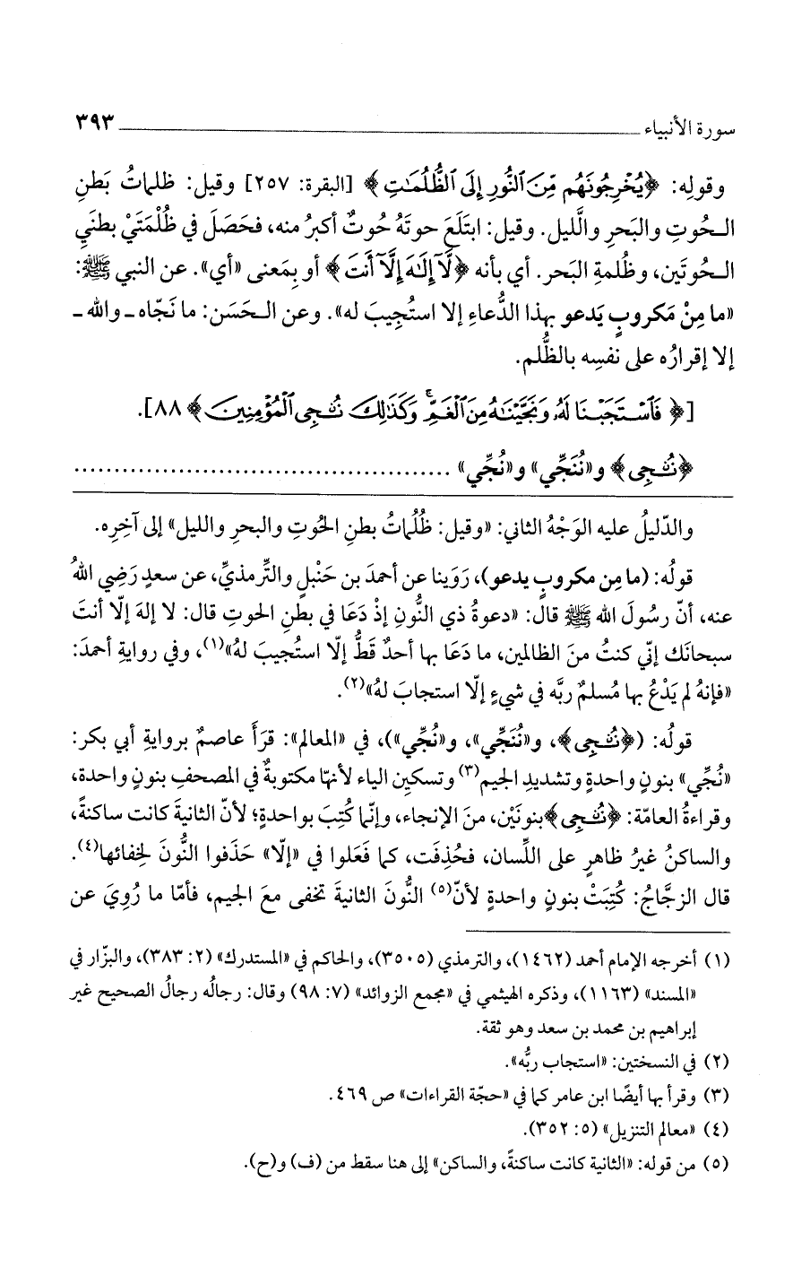 وقوله (يُخْرِجُونَهُمْ مِنَ النُّورِ إِلَى الظُّلُماتِ) [البقرة: 257] وقيل: ظلمات بطن الحوت والبحر والليل. وقيل: ابتلع حوته حوت أكبر منه، فحصل في ظلمتى بطني الحوتين وظلمة البحر. أى بأنه (لا إِلهَ إِلَّا أَنْتَ) أو بمعنى «أى». عن النبي صلى الله عليه وسلم «ما من مكروب يدعو بهذا الدعاء إلا استجيب له» وعن الحسن: ما نجاه والله إلا إقراره على نفسه بالظلم.