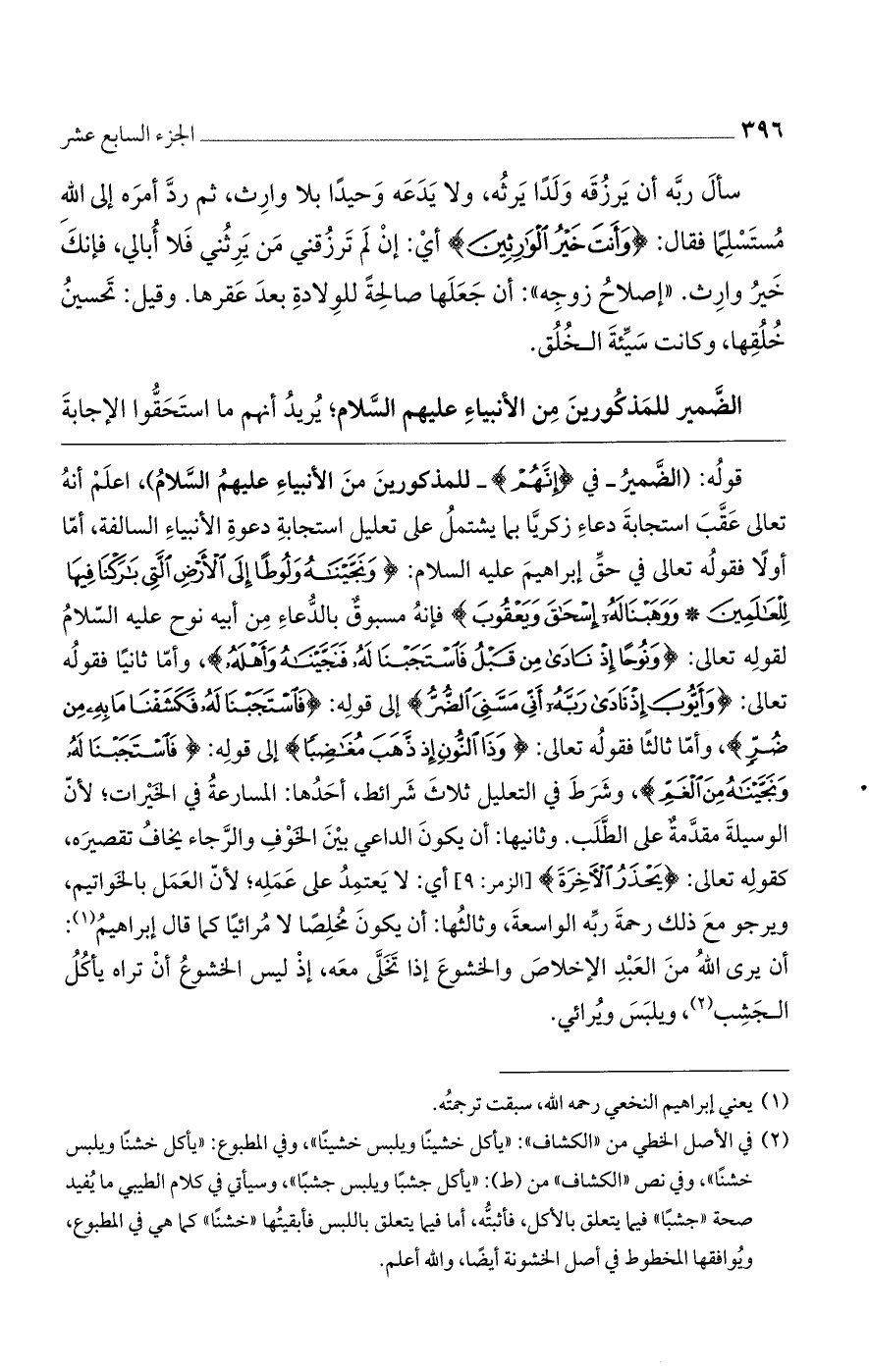 قوله: (الضميرُ- في (إِنَّهُمْ) - للمذكورين من الأنبياء عليهم السلامُ)، اعلمْ أنهُ تعالى عقب استجابة دعاءِ زكرياَّ بما يشتملُ على تعليل استجابة دعوة الأنبياء السالفة، أما أولاً فقوله تعالى في حق إبراهيم عليه السلام: (وَنَجَّيْنَاهُ وَلُوطاً إِلَى الأَرْضِ الَّتِي بَارَكْنَا فِيهَا لِلْعَالَمِينَ * وَوَهَبْنَا لَهُ إِسْحَقَ وَيَعْقُوبَ) فإنه مسبوقٌ بالدعاء من أبيه نوح عليه السلامُ لقوله تعالى: (وَنُوحاً إِذْ نَادَى مِنْ قَبْلُ فَاسْتَجَبْنَا لَهُ فَنَجَّيْنَاهُ وَأَهْلَهُ)، وأما ثانياً فقوله تعالى: (وَأَيُّوبَ إِذْ نَادَى رَبَّهُ أَنِّي مَسَّنِي الضُّرُّ) إلى قوله: (فَاسْتَجَبْنَا لَهُ فَكَشَفْنَا مَا بِهِ مِنْ ضُرٍّ)، وأما ثالثاً فقوله تعالى: (وَذَا النُّونِ إِذْ ذَهَبَ مُغَاضِباً) إلى قوله: (فَاسْتَجَبْنَا لَهُ وَنَجَّيْنَاهُ مِنْ الْغَمِّ)، وشرط في التعليل ثلاث شرائط، أحدها: المسارعة في الخيرات؛ لأن الوسيلة مقدمةٌ على الطلب. وثانيها: أن يكون الداعي بين الخوف والرجاء يخافُ تقصيره، كقوله تعالى: (يَحْذَرُ الآخِرَةَ) [الزمر: 9] أي: لا يعتمدُ على عمله؛ لأن العمل بالخواتيم، ويرجو مع ذلك رحمةَ ربه الواسعة، وثالثها: أن يكون مخلصاً لا مُرائياً كما قال إبراهيم: أن يرى الله من العبد الإخلاص والخشوع إذا تخلى معه، إذ ليس الخشوعُ أن تراه يأكل الجشب، ويلبس ويُرائي.