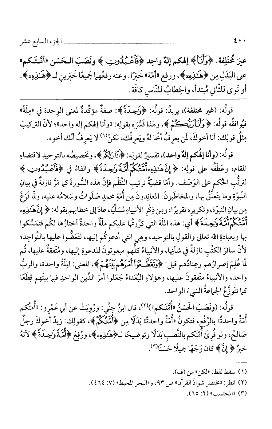 قوله: (ونصب الحسنُ "أمتكم")، قال ابن جني: ورويت عن أبي عمرو: "أمتكم أمةٌ واحدةٌ" بالرفع، فتكونُ "أمةٌ واحدةٌ" بدلاً من (أُمَّتُكُمْ)، كقولك: زيدٌ أخوك رجلٌ صالحٌ، ولو قرئ أمتكم بالنصب بدلاً وتوضيحاً لـ (هذه)، ورُفع (أُمَّةً وَاحِدَةً) لأنه خبرُ (إنَّ) كان وجهاً جميلاً حسناً.