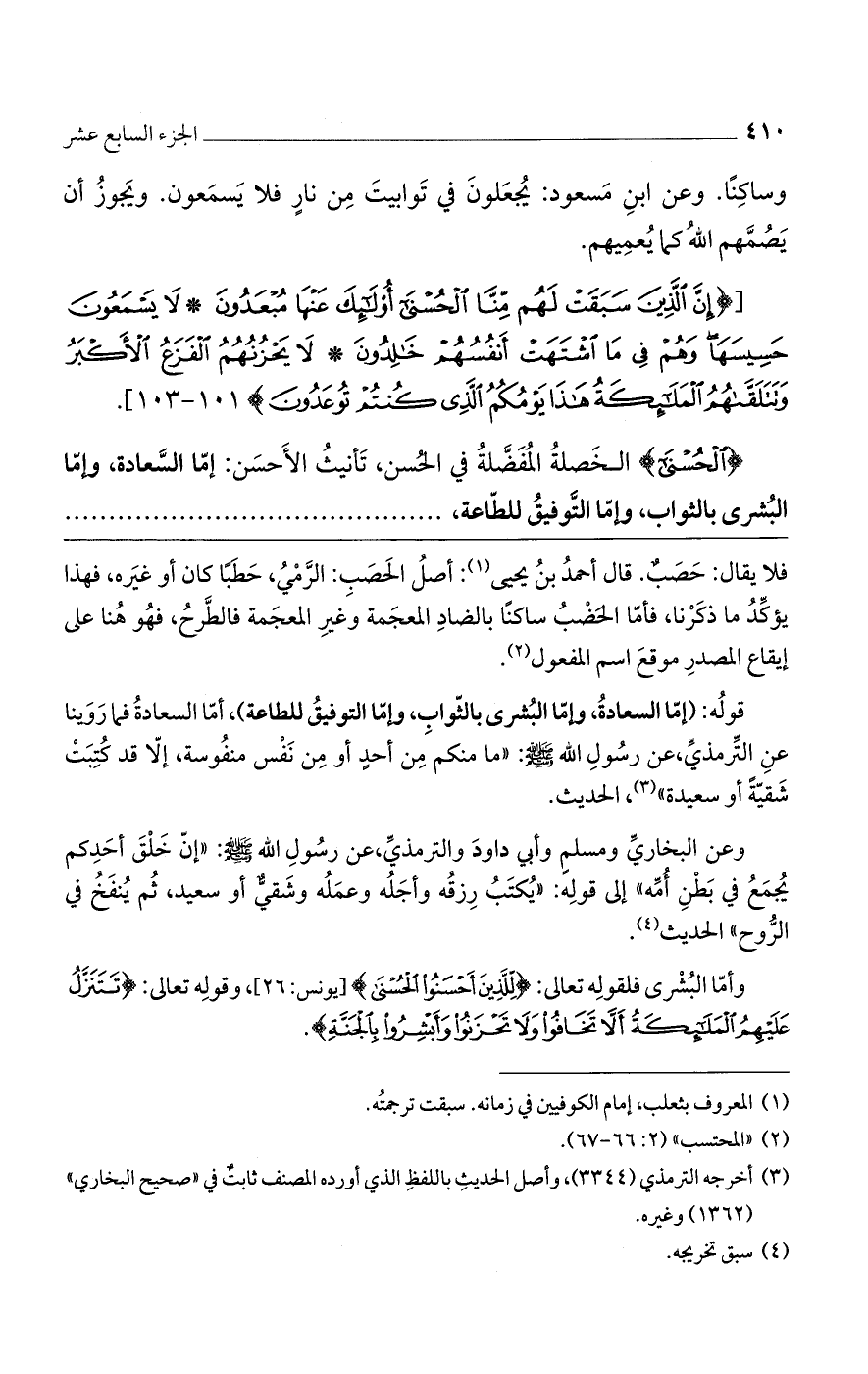 قوله: (إما السعادةُ، وإما البشرى بالثواب، وإما التوفيق للطاعة)، أما السعادةُ فما روينا عن الترمذي، عن رسول الله صلى الله عليه وسلم: "ما منكم من أحدٍ أو من نفس منفوسة، إلا قد كُتبت شقيةً أو سعيدة"، الحديث.