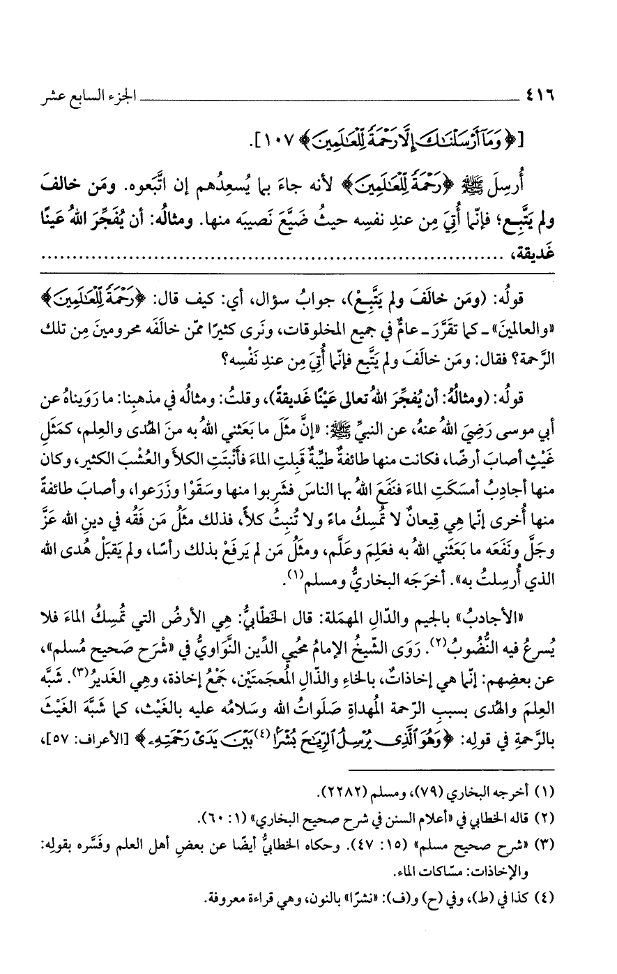قوله: (ومثالهُ: أن يُفجر الله تعالى عيناً غديقةً)، وقلتُ: ومثاله في مذهبنا: ما رويناه عن أبي موسى رضي الله عنه، عن النبي صلى الله عليه وسلم: "إن مثل ما بعثني الله به من الهدى والعلم، كمثل غيثٍ أصاب أرضاً، فكانت منها طائفةٌ طيبةٌ قبلت الماء فأنبتت الكلأ والعُشب الكثير، وكان منها أجادب أمسكت الماء فنفع الله بها الناس فشربوا منها وسقوا وزرعوا، وأصاب طائفةً منها أخرى إنما هي قيعانٌ لا تمسكُ ماءً ولا تنبتُ كلأ، فذلك مثلُ من فقه في دين الله عز وجل ونفعه ما بعثني الله به فعلم وعلم، ومثلُ من لم يرفع بذلك رأسا، ولم يقبل هدى الله الذي أرسلت به". أخرجه البخاري ومسلم.