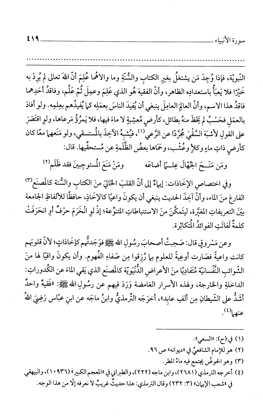وعن مسروقٍ قال: صحبتُ أصحاب رسول الله صلى الله عليه وسلم فوجدتهم كإخاذاتٍ؛ لأن قلوبهم كانت واعيةً فصارت أوعيةً للعلوم بما رزقوا من صفاء الفهوم. وأن يكون واقياً لها من الشوائب النفسانية متفادياً من الأعراض الدنيوية كالمصنع الذي يقي الماء عن الكدورات: الداخلة والخارجة، ولهذه الأسرار الغامضة ورد فيهم عن رسول الله صلى الله عليه وسلم: "فقيهٌ واحدٌ أشدُّ على الشيطان من ألف عابد"، أخرجه الترمذي وابن ماجه عن ابن عباس رضي الله عنهما.