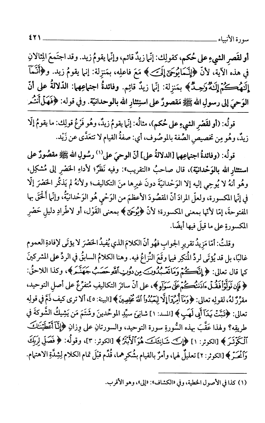 وقلتُ: أما مزيدُ تقرير الجواب فهو أن الكلام الذي يفيد الحصر لا يؤتى لإفادة العموم غالباً، بل قد يؤتى لرد المنكر فيما وقع النزاع فيه. وهنا الكلام السابق في الرد على المشركين كما قال تعالى: (إِنَّكُمْ وَمَا تَعْبُدُونَ مِنْ دُونِ اللَّهِ حَصَبُ جَهَنَّمَ)، وكذا اللاحق: (فَإِنْ تَوَلَّوْا فَقُلْ آذَنْتُكُمْ عَلَى سَوَاءٍ)، على أن سائر التكاليف متفرعٌ على أصل التوحيد، مقررٌ له، لقوله تعالى: (وَمَا أُمِرُوا إِلاَّ لِيَعْبُدُوا اللَّهَ مُخْلِصِينَ) [البينة: 5]، ألا ترى كيف ذم في قوله تعالى: (تَبَّتْ يَدَا أَبِي لَهَبٍ) [المسد: 1] شانئ سيد الموحدين وشتم من يشيكُ الشوكة في طريقه؟ ولهذا عقب بهذه السورة سورة التوحيد، والسورتان على وزان (إِنَّا أَعْطَيْنَاكَ الْكَوْثَرَ) [الكوثر: 1] (إِنَّ شَانِئَكَ هُوَ الأَبْتَر) [الكوثر: 3]، وقوله: (فَصَلِّ لِرَبِّكَ وَانْحَرْ) [الكوثر: 2] تعليلٌ لهما، وأمرٌ بالقيام بشكرهما، قُدم قبل تمام الكلام لشدة الاهتمام.