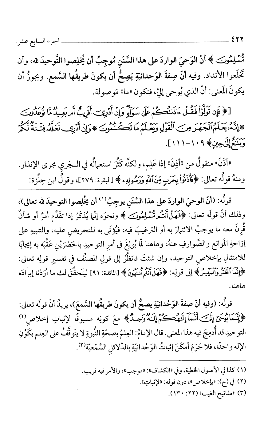 قوله: (أن الوحي الوارد على هذا السنن يوجب أن يخلصوا التوحيد لله تعالى)، وذلك أن قوله تعالى: (فَهَلْ أَنْتُمْ مُسْلِمُونَ) ونحوه إنما يُذكر إذا تقدم أمرٌ أو شأنٌ قُرنَ معه ما يوجبُ الائتمار به أو الترغيب فيه، فيؤتى به للتحريض عليه، والتنبيه على إزاحة الموانع والصوارف عنه، وهاهنا لما بولغ في أمر التوحيد بالحصرين عقبه به إيجاباً للامتثال بإخلاص التوحيد، وإن شئت فانظر إلى قول المصنف في تفسير قوله تعالى: (إِنَّمَا الْخَمْرُ وَالْمَيْسِرُ) إلى قوله: (فَهَلْ أَنْتُمْ مُنتَهُونَ) [المائدة: 91] ليتحقق لك ما أردنا إيراده هاهنا.