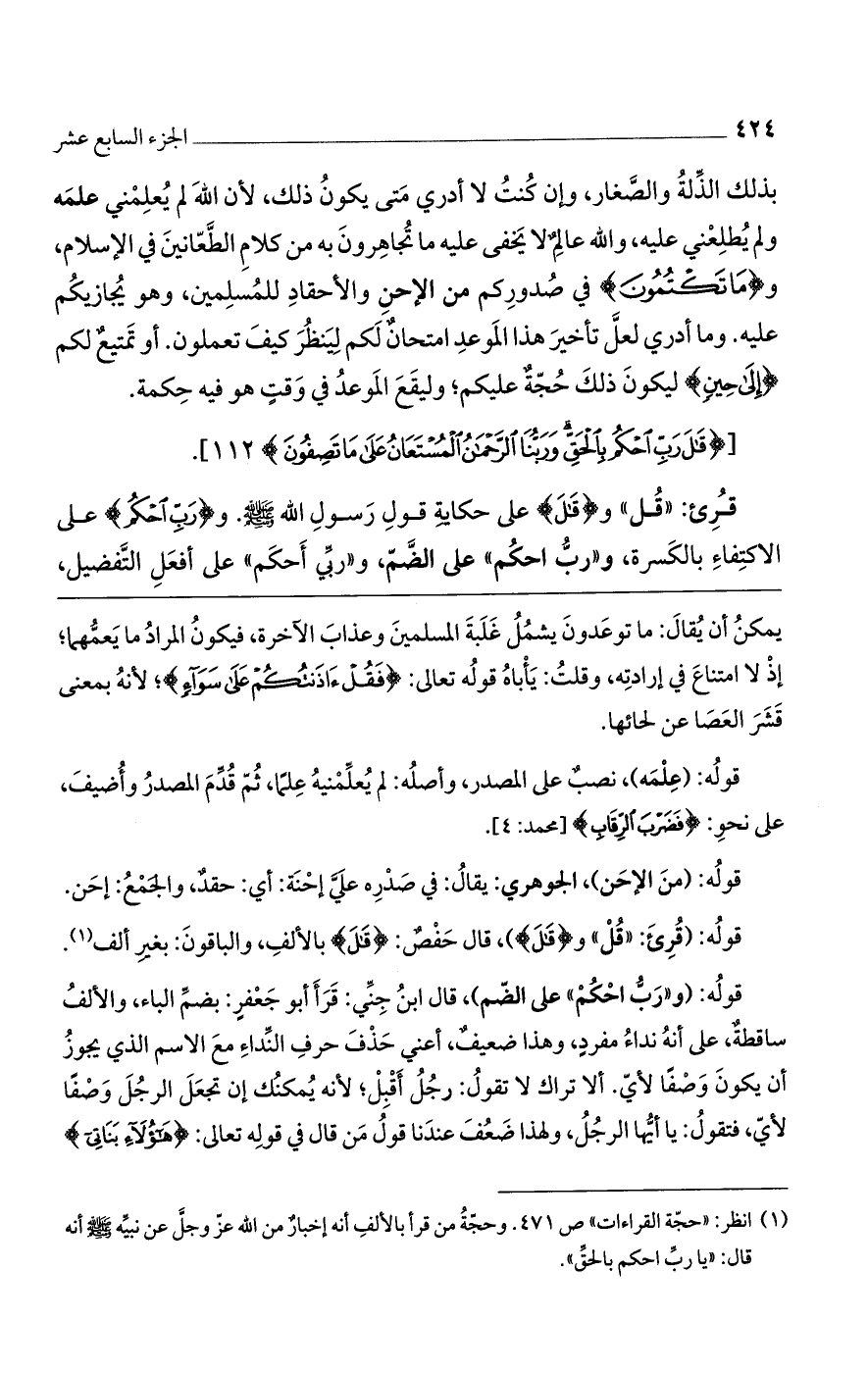 قوله: (و"رَبُّ احكُمْ" على الضم)، قال ابن جني: قرأ أبو جعفر: بضم الباء، والألفُ ساقطةٌ، على أنه نداءُ مفردٍ، وهذا ضعيفٌ، أعني حذف حرف النداء مع الاسم الذي يجوز أن يكون وصفاً لأي. ألا تراك لا تقولُ: رجلُ أقبِلْ؛ لأنه يمكنك إن تجعل الرجُلَ وصفاً لأي، فتقولُ: يا أيها الرجلُ، ولهذا ضَعُفَ عندنا قولُ من قال في قوله تعالى: (هَؤُلاءِ بَنَاتِي)