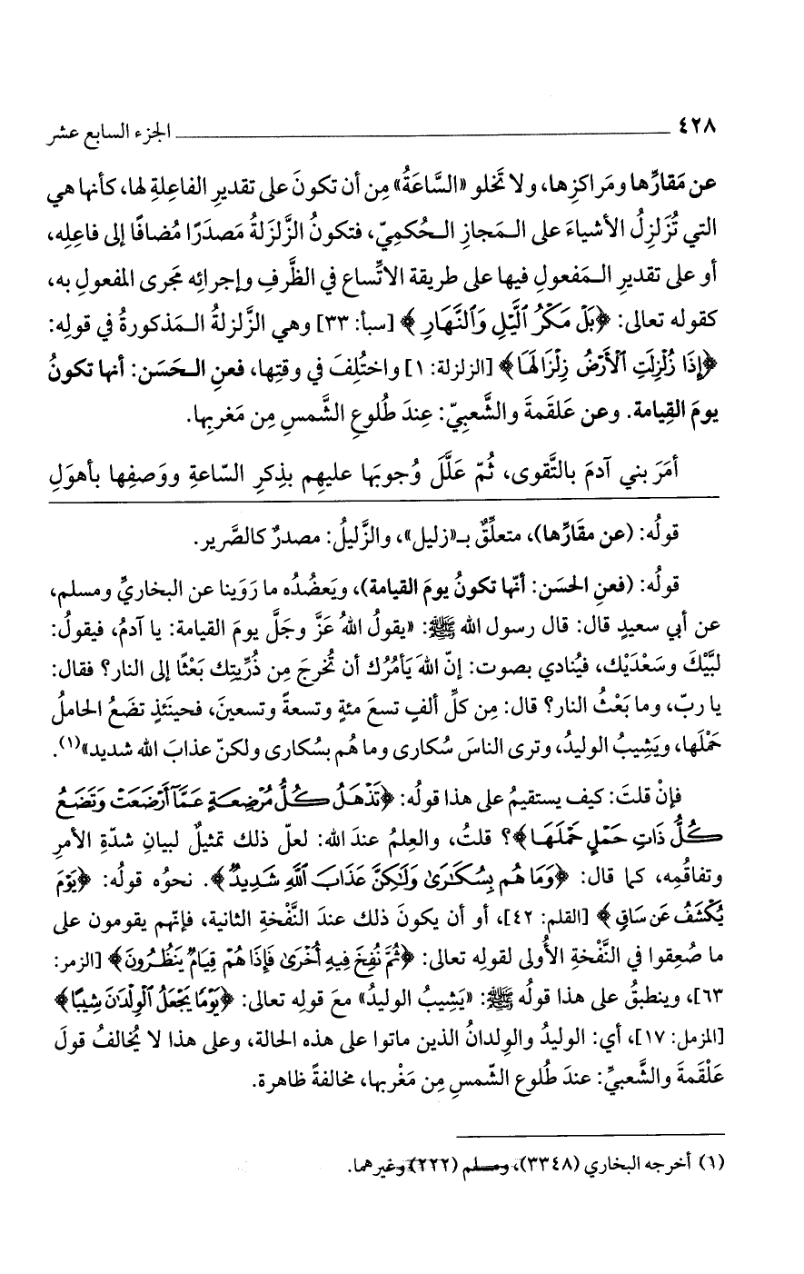 فإن قلت: كيف يستقيم على هذا قوله: (تَذْهَلُ كُلُّ مُرْضِعَةٍ عَمَّا أَرْضَعَتْ وَتَضَعُ كُلُّ ذَاتِ حَمْلٍ حَمْلَهَا)؟ قلتُ، والعلمُ عند الله: لعل ذلك تمثيلٌ لبيان شدة الأمر وتفاقمه، كما قال: (وَمَا هُمْ بِسُكَارَى وَلَكِنَّ عَذَابَ اللَّهِ شَدِيدٌ). نحو قوله: (يَوْمَ يُكْشَفُ عَنْ سَاقٍ) [القلم: 42]، أو أن يكون ذلك عند النفخة الثانية، فإنهم يقومون على ما صُعقوا في النفخة الأولى لقوله تعالى: (ثُمَّ نُفِخَ فِيهِ أُخْرَى فَإِذَا هُمْ قِيَامٌ يَنْظُرُونَ) [الزمر: 63]، وينطبقُ على هذا قوله صلى الله عليه وسلم: "يشيبُ الوليدُ" مع قوله تعالى: (يَوْماً يَجْعَلُ الْوِلْدَانَ شِيباً) [المزمل: 17]، أي: الوليدُ والولدانُ الذين ماتوا على هذه الحالة، وعلى هذا لا يخالف قول علقمة والشعبي: عند طلوع الشمس من مغربها، مخالفةً ظاهرة.