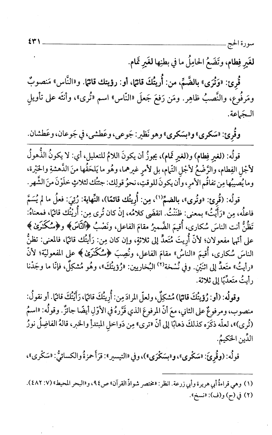 قوله: (قرئ: "وُترى"، بالضم، من: أُريتُك قائماً)، النهاية: رُئي: فعلُ ما لم يُسم فاعله، من "رأيتُ" بمعنى: ظننتُ. انقضى كلامُه، إن كان تُرى مِن: أريتُك قائماً، فمعناهُ: تظنُّ أنت الناس سُكارى، أقيم الضميرُ مقام الفاعل، ونصبُ (النَّاسَ) و (سُكَارَى) على أنهما مفعولان؛ لأن أُريت مُتعدٍّ إلى ثلاثةٍ، وإن كان من: رأيتُك قائماً، فالمعنى: تظنُّ الناس سُكارى، أقيم "الناسُ" مقام الفاعل، ونُصبَ (سُكَارَى) على المفعولية؛ لأن "رأيتُ" متعدٍّ إلى اثنين. وفي نُسخة البخاريين: "رُؤيتُكَ"، وهو مشكلٌ، فإنا ما وجدنا رأيتُ متعدياً إلى ثلاثة.