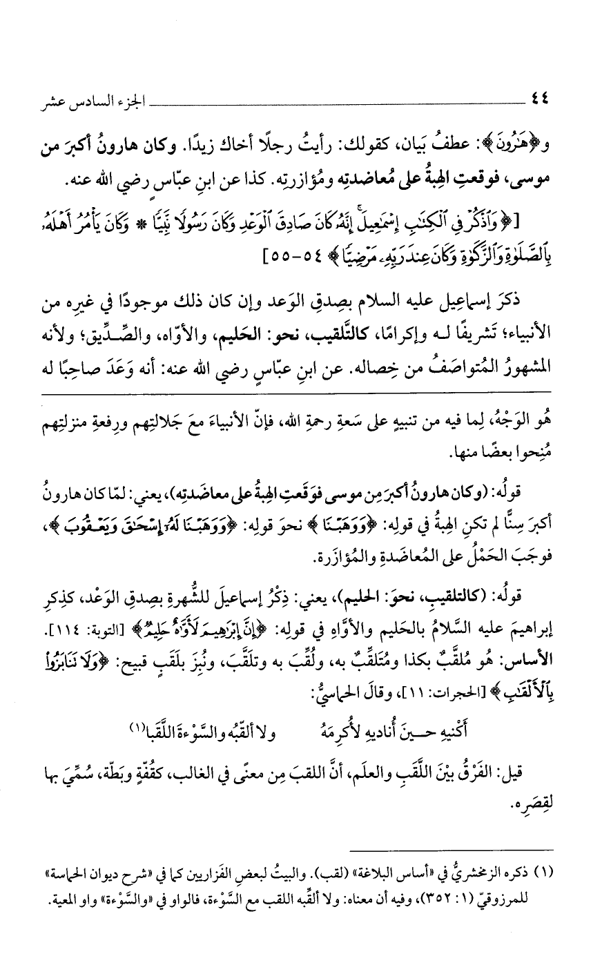 قوله: (كالتقليب، نحو: الحليم)، يعني: ذكر إسماعيل للشهرة بصدق الوعد، كذكر إبراهيم عليه السلام بالحليم والأواه في قوله: (إنَّ إبْرَاهِيمَ لأَوَّاهٌ حَلِيمٌ) [التوبة: 114]، الأساس: هو ملقبٌ بكذا ومتلقبٌ به، ولقب به وتلقب، ونبز بلقبٍ قبيح: (ولا تَنَابَزُوا بِالأَلْقَابِ) [الحجرات: 11]، وقال: الحماسي: