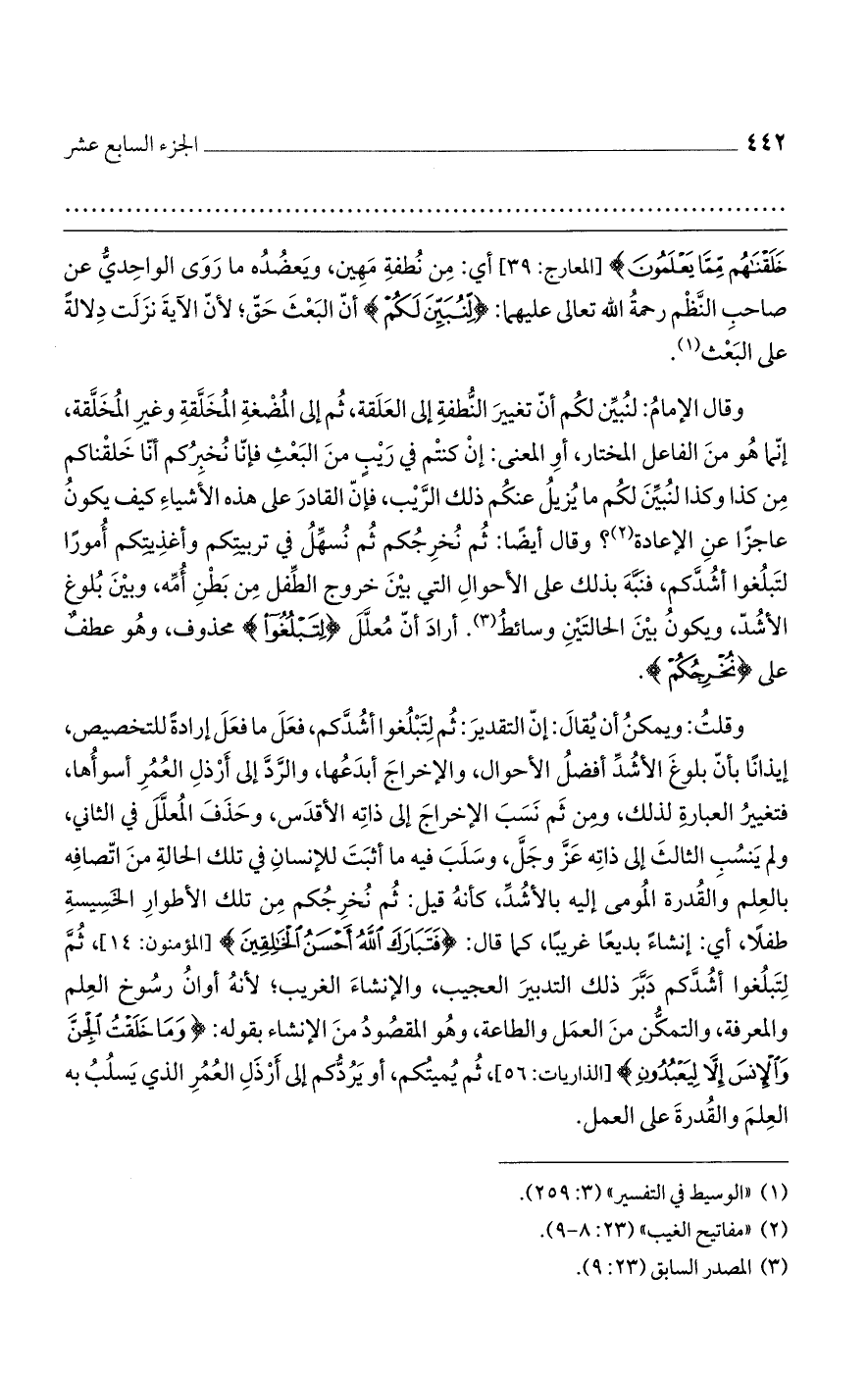 خَلَقْنَاهُمْ مِمَّا يَعْلَمُونَ) [المعارج: 39] أي: من نُطفةِ مهين، ويعضده ما روى الواحديُّ عن صاحب النظم رحمة الله تعالى عليهما: (لِنُبَيِّنَ لَكُمْ) أن البعث حق؛ لأن الآية نزلت دلالةً على البعث.