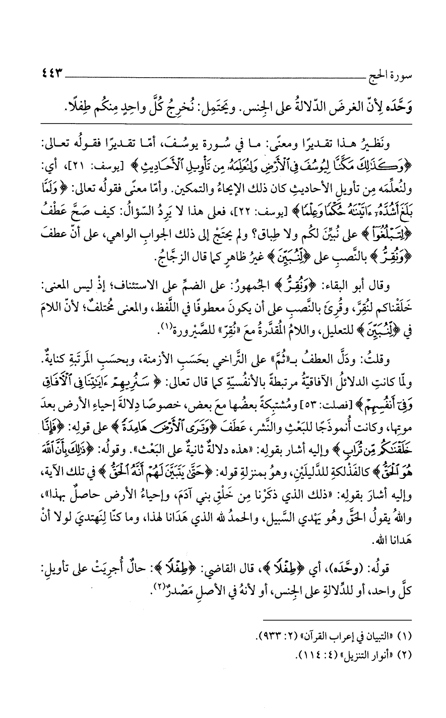 ونظيرُ هذا تقديراً ومعنى: ما في سورة يوسف، أما تقديراً فقوله تعالى: (وَكَذَلِكَ مَكَّنَّا لِيُوسُفَ فِي الأَرْضِ وَلِنُعَلِّمَهُ مِنْ تَاوِيلِ الأَحَادِيثِ) [يوسف: 21]، أي: ولنُعلمه من تأويل الأحاديث كان ذلك الإيحاء والتمكين. وأما معنى فقوله تعالى: (وَلَمَّا بَلَغَ أَشُدَّهُ آتَيْنَاهُ حُكْماً وَعِلْماً) [يوسف: 22]، فعلى هذا لا يردُ السؤال: كيف صح عطفُ (لِتَبْلُغُوا) على نبين لكم ولا طباق؟ ولم يحتج إلى ذلك الجواب الواهي، على أن عطف (وَنُقِرُّ) بالنصب على (لِنُبَيِّنَ) غيرُ ظاهرٍ كما قال الزجاج.