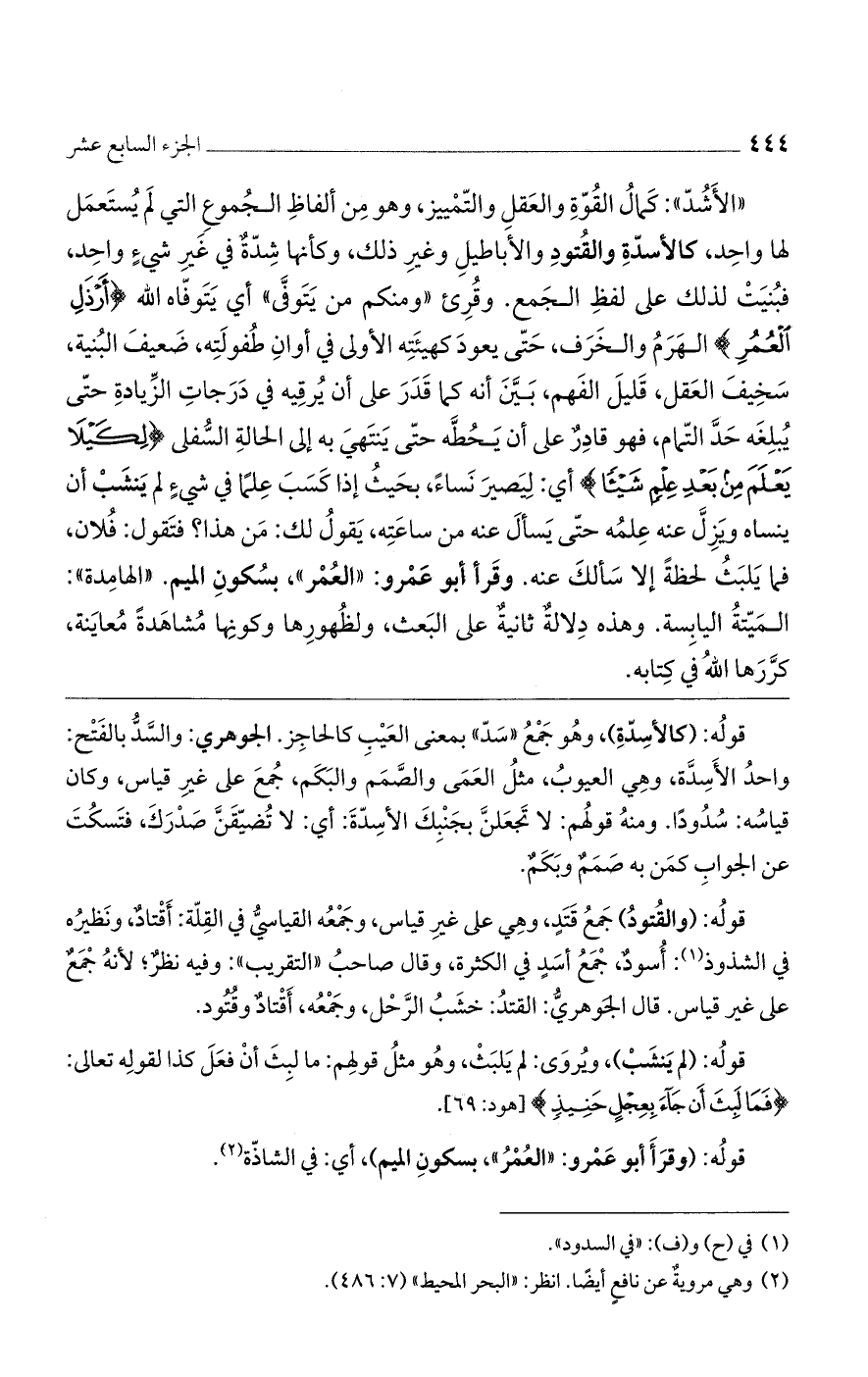 "الأشد": كمال القوة والعقل والتمييز، وهو من ألفاظ الجموع التي لم يستعمل لها واحد كالأسدّة والقتود والأباطيل وغير ذلك، وكأنها شدّة في غير شيء واحد، فبنيت لذلك على لفظ الجمع. وقرئ: "ومنكم من يتوفى"، أى يتوفاه الله (أَرْذَلِ الْعُمُرِ) الهرم والخرف، حتى يعود كهيئته الأولى في أوان طفولته: ضعيف البنية، سخيف العقل، قليل الفهم. بين أنه كما قدر على أن يرقيه في درجات الزيادة حتى يبلغه حد التمام، فهو قادر على أن يحطه حتى ينتهى به إلى الحالة السفلى (لِكَيْلا يَعْلَمَ مِنْ بَعْدِ عِلْمٍ شَيْئاً) أى: ليصير نساء بحيث إذا كسب علما في شيء لم ينشب أن ينساه ويزل عنه علمه حتى يسأل عنه من ساعته، يقول لك: من هذا؟ فتقول: فلان، فما يلبث لحظة إلا سألك عنه. وقرأ أبو عمرو: "العمر"، بسكون الميم. "الهامدة": الميتة اليابسة. وهذه دلالة ثانية على البعث، ولظهورها وكونها مشاهدة معاينة، كررها الله في كتابه.