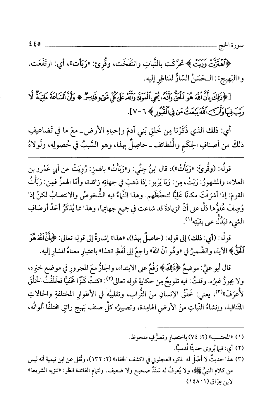 (اهْتَزَّتْ وَرَبَتْ) تحرّكت بالنبات وانتفخت، وقرئ: "ربأت"، أى ارتفعت. و"البهيج": الحسن السارّ للناظر إليه.