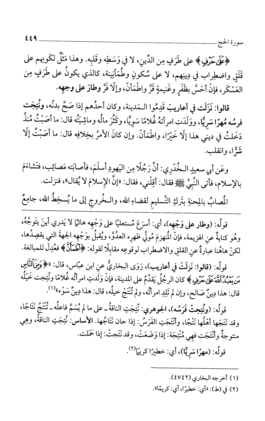 قوله: (قالوا: نزلت في أعاريب)، روى البخاري عن ابن عباس، قال: " (وَمِنْ النَّاسِ مَنْ يَعْبُدُ اللَّهَ عَلَى حَرْفٍ) كان الرجل يقدم على المدينة، فإن ولدت امرأته غلاماً ونتجت خيله قال: هذا دينٌ صالح، وإن لم تلد امرأته، ولم تنتج خيله، قال: هذا دينٌ سوء".