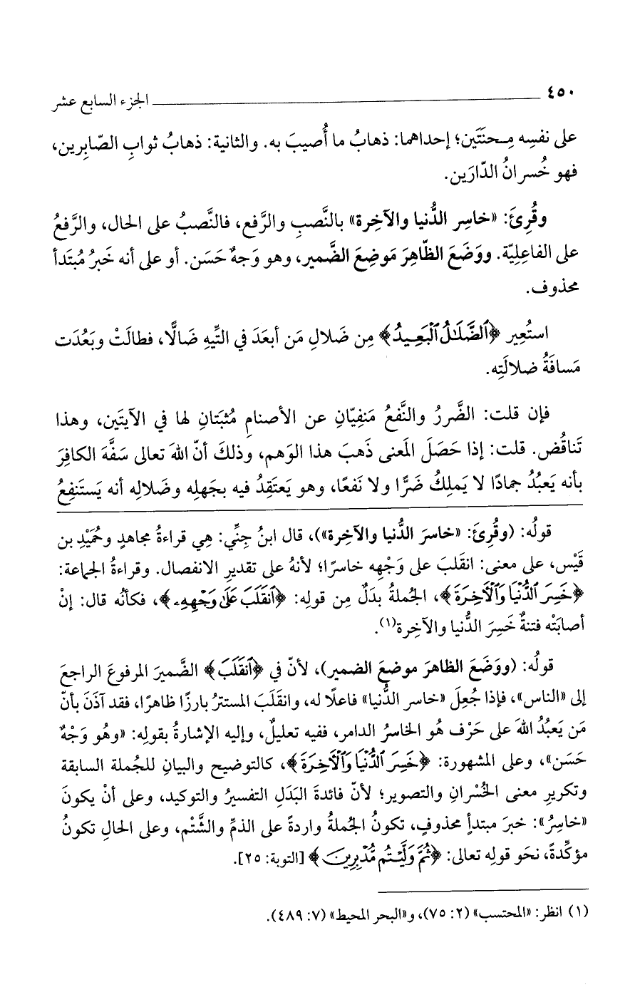 قوله: (وقرئ: "خاسر الدنيا والآخرة")، قال ابن جني: هي قراءة مجاهد وحُميد بن قيس، على معنى: انقلب على وجهه خاسراً؛ لأنه على تقديرالانفصال. وقراءة الجماعة: (خَسِرَ الدُّنْيَا وَالآخِرَةَ)، الجملة بدل من قوله: (انقَلَبَ عَلَى وَجْهِهِ)، فكأنه قال: إن أصابته فتنةٌ خسر الدنيا والآخرة.