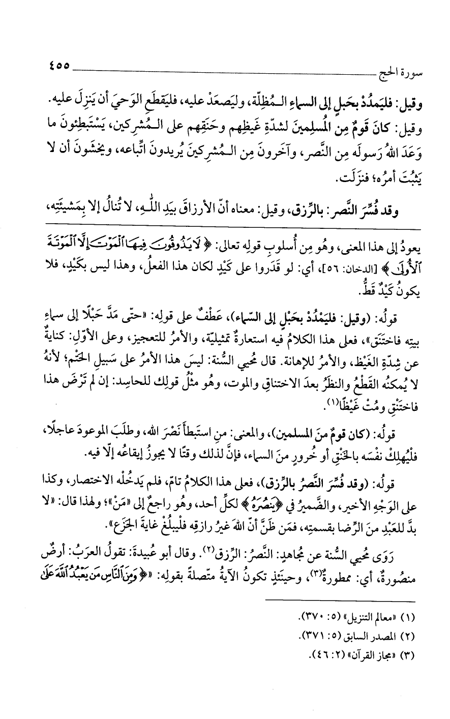 روى محيي السنة عن مجاهد: النصرُ: الرزق. وقال أبو عبيدة: تقول العربُ: أرضٌ منصورةٌ، أي: ممطورةٌ، وحينئذٍ تكونُ الآية متصلةً بقوله: " (وَمِنْ النَّاسِ مَنْ يَعْبُدُ اللَّهَ عَلَى