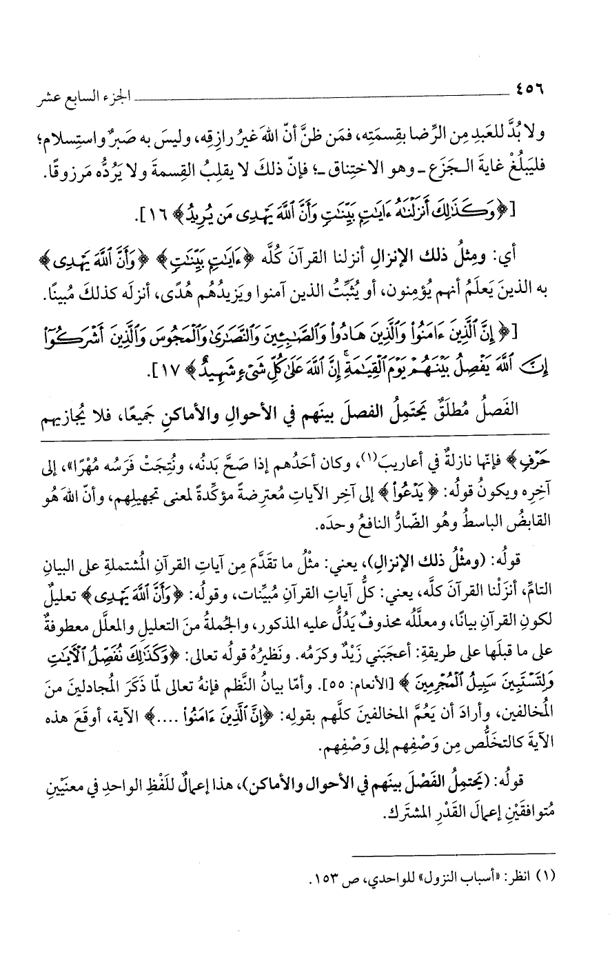 قوله: (ومثلُ ذلك الإنزال)، يعني: مثل ما تقدم من آيات القرآن المشتملة على البيان التام، أنزلنا القرآن كله، يعني: كل آيات القرآن مبنيات، وقوله: (وَأَنَّ اللَّهَ يَهْدِي) تعليلٌ لكون القرآن بياناً، ومعلله محذوفٌ يدل عليه المذكور، والجملة من التعليل والمعلل معطوفةٌ على ما قبلها علىطريقة: أعجبني زيدٌ وكرمُه. ونظيره قوله تعالى: (وَكَذَلِكَ نُفَصِّلُ الآيَاتِ وَلِتَسْتَبِينَ سَبِيلُ الْمُجْرِمِينَ) [الأنعام: 55]. وأما بيانُ النظم فنه تعالى لما ذكر المجادلين من المخالفين، وأراد أن يعم المخالفين كلهم بقوله: (إِنَّ الَّذِينَ آمَنُوا ... ) الآية، أوقع هذه الآية كالتخلص من وصفهم إلى وصفهم.
