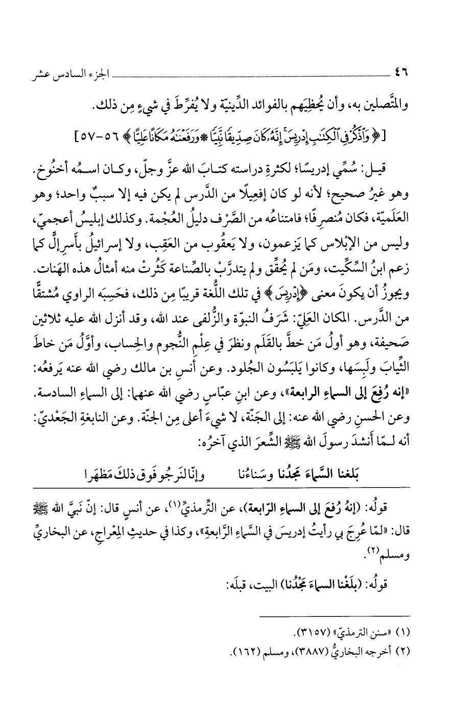 قوله: (إنه رفع إلى السماء الرابعة)، عن الترمذي، عن أنسٍ قال: إن نبي الله صلى الله عليه وسلم قال: ((لما عرج بي رأيت إدريس في السماء الرابعة))، وكذا في حديث المعراج، عن البخاري ومسلم.