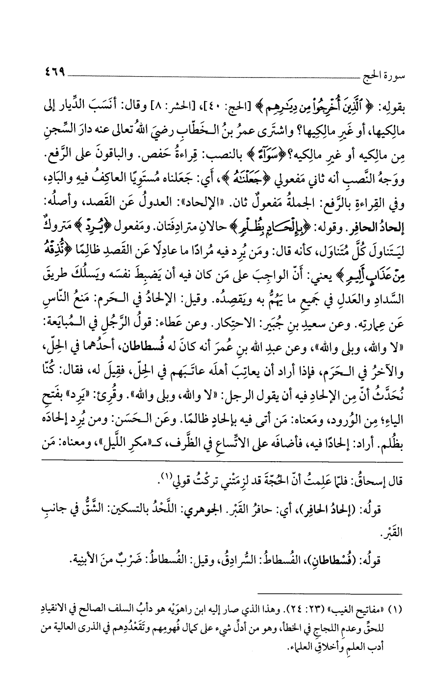 بقوله (الَّذِينَ أُخْرِجُوا مِنْ دِيارِهِمْ) [الحج: 40]، [الحشر: 8] وقال أنسب الديار إلى مالكيها، أو غير مالكيها؟ واشترى عمر بن الخطاب رضى الله تعالى عنه دار السجن من مالكيه أو غير مالكيه؟ (سَواءً) بالنصب: قراءة حفص. والباقون على الرفع. ووجه النصب أنه ثانى مفعولي (جعلناه)، أى: جعلناه مستويا الْعاكِفُ فِيهِ وَالْبادِ وفي القراءة بالرفع. الجملة مفعول ثان. "الإلحاد": العدول عن القصد، وأصله إلحاد الحافر. وقوله (بِإِلْحادٍ بِظُلْمٍ) حالان مترادفتان. ومفعول (يُرِدْ) متروك ليتناول كل متناول، كأنه قال: ومن يرد فيه مرادا ما عادلا عن القصد ظالما (نُذِقْهُ مِنْ عَذابٍ أَلِيمٍ) يعنى أنّ الواجب على من كان فيه أن يضبط نفسه ويسلك طريق السداد والعدل في جميع ما يهمّ به ويقصده. وقيل: الإلحاد في الحرم منع الناس عن عمارته وعن سعيد بن جبير: الاحتكار. وعن عطاء: قول الرجل في المبايعة «لا والله، وبلى والله» وعن عبد الله بن عمر أنه كان له فسطاطان، أحدهما: في الحل، والآخر في الحرم، فإذا أراد أن يعاتب أهله عاتبهم في الحل، فقيل له، فقال، كنا نحدث أن من الإلحاد فيه أن يقول الرجل: "لا والله، وبلى والله". وقرئ: "يرد"، بفتح الياء من الورود. ومعناه: من أتى فيه بإلحاد ظالما. وعن الحسن: ومن يرد إلحاده بظلم، أراد: إلحادا فيه، فأضافه على الاتساع في الظرف، كـ"مكر الليل". ومعناه: من