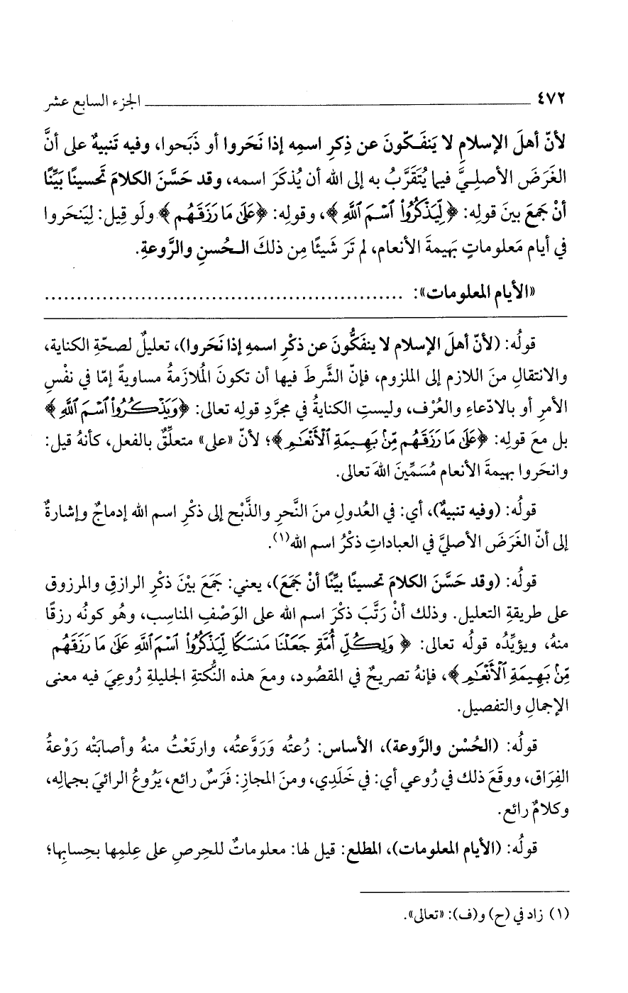 قوله: (لأن أهل الإسلام لا ينفكون عن ذكر اسمه إذا نحروا)، تعليلٌ لصحة الكناية، والانتقال من اللازم إلى الملزوم، فإن الشرط فيها أن تكون الملازمة مساويةً إما في نفس الأمر أو بالادعاء والعرف، وليست الكناية في مجرد قوله تعالى: (وَيَذْكُرُوا اسْمَ اللَّهِ) بل مع قوله: (عَلَى مَا رَزَقَهُمْ مِنْ بَهِيمَةِ الأَنْعَامِ)؛ لأن "على" متعلقٌ بالفعل، كأنه قيل: وانحروا بهيمة الأنعام مسمين الله تعالى.