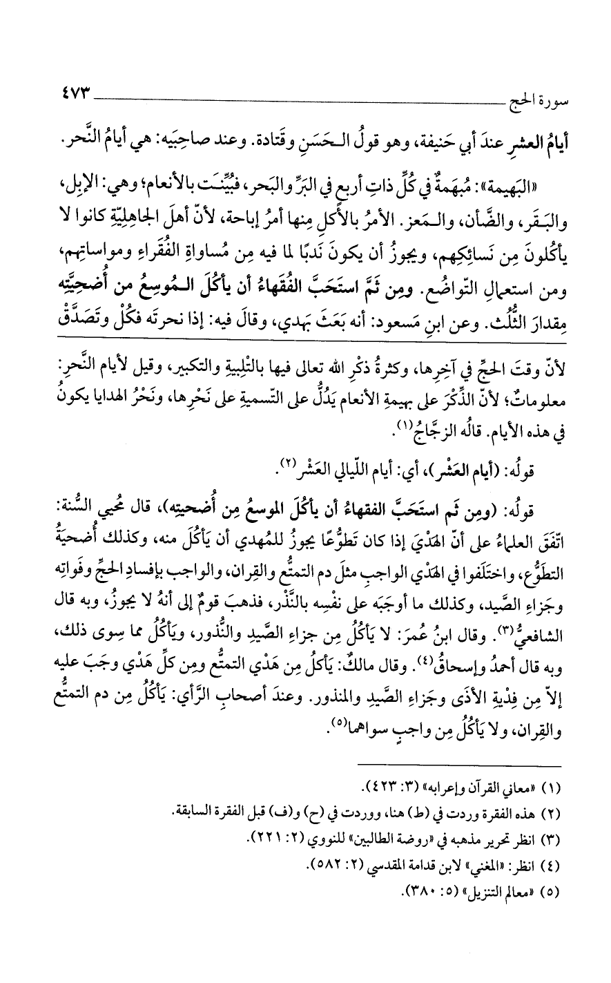"البهيمة": مبهمة في كل ذات أربع في البر والبحر، فبينت بالأنعام: وهي الإبل والبقر والضأن والمعز. الأمر بالأكل منها أمر إباحة، لأن أهل الجاهلية كانوا لا يأكلون من نسائكهم، ويجوز أن يكون ندبا لما فيه من مساواة الفقراء ومواساتهم ومن استعمال التواضع. ومن ثمة استحب الفقهاء أن يأكل الموسع من أضحيته مقدار الثلث. وعن ابن مسعود أنه بعث بهدى وقال فيه: إذا نحرته فكل وتصدّق