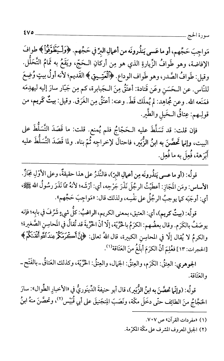 مواجب حجهم، أو ما عسى ينذرونه من أعمال البر في حجهم (وَلْيَطَّوَّفُوا) طواف الإفاضة، وهو طواف الزيارة الذي هو من أركان الحج، ويقع به تمام التحلل. وقيل: طواف الصدر، وهو طواف الوداع (الْعَتِيقِ) القديم، لأنه أول بيت وضع للناس عن الحسن. وعن قتادة: أعتق من الجبابرة، كم من جبار سار إليه ليهدمه فمنعه الله. وعن مجاهد: لم يملك قط. وعنه: أعتق من الغرق. وقيل: بيت كريم، من قولهم: عتاق الخيل والطير.