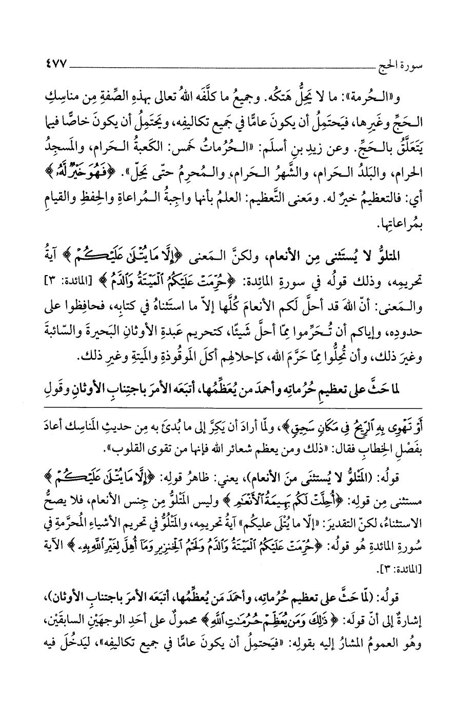 قوله: (المتلو لا يُستثنى من الأنعام)، يعني: ظاهرُ قوله: (إِلاَّ مَا يُتْلَى عَلَيْكُمْ) مستثنى من قوله: (أُحِلَّتْ لَكُمْ بَهِيمَةُ الأَنْعَامِ) وليس المتلو من جنس الأنعام، فلا يصحُّ الاستثناء، لكن التقدير: "إلا ما يتلى عليكم" آية تحريمه" آية تحريمه، والمتلو في تحريم الأشياء المحرمة في سورة المائدة هو قوله: (حُرِّمَتْ عَلَيْكُمْ الْمَيْتَةُ وَالدَّمُ وَلَحْمُ الْخِنزِيرِ وَمَا أُهِلَّ لِغَيْرِ اللَّهِ بِهِ) الآية [المائدة: 3].