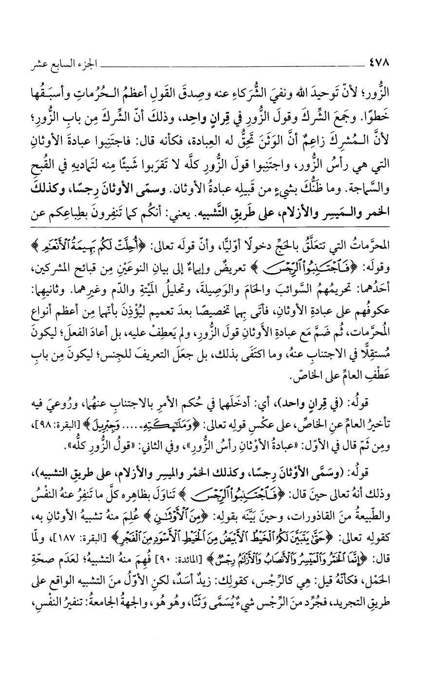 المحرماتُ التي تتعلق بالحج دخولاً أولياً، وأن قوله تعالى: (أُحِلَّتْ لَكُمْ بَهِيمَةُ الأَنْعَامِ) وقوله: (فَاجْتَنِبُوا الرِّجْسَ) تعريضٌ وإيماءٌ إلى بيان النوعين من قبائح المشركين، أحدهما: تحريمهم السوائب والحام والوصيلة، وتحليل الميتة والدم وغيرهما. وثانيهما: عكوفهم على عبادة الأوثان، فأتى بهما تخصيصاً بعد تعميم ليؤذن بأنهما من أعظم أنواع المحرمات، ثم ضم مع عبادة الأوثان قول الزور، ولم يعطف عليه، بل أعاد الفعل؛ ليكون مستقلاً في الاجتناب عنهُ، وما اكتفي بذلك، بل جعل التعريف للجنس؛ ليكون من باب عطفِ العامِّ على الخاص.