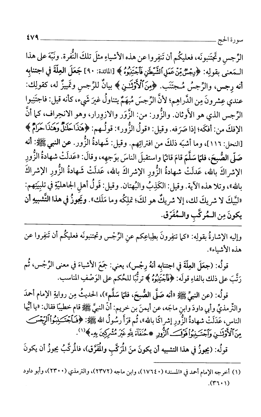 قوله: (عن النبي صلى الله عليه وسلم "أنه صلى الصبح، فلما سلم")، الحديث من رواية الإمام أحمد والترمذي وأبي داود وابن ماجه، عن أيمن بن خريم: أن النبي صلى الله عليه وسلم قام خطيباً فقال: "يا أيها الناس، عدلت شهادة الزُّور إشراكاً بالله" ثم قرأ رسول الله صلى الله عليه وسلم: فَاجْتَنِبُوا الرِّجْسَ مِنْ الأَوْثَانِ وَاجْتَنِبُوا قَوْلَ الزُّورِ * حُنَفَاءَ لِلَّهِ غَيْرَ مُشْرِكِينَ بِهِ).