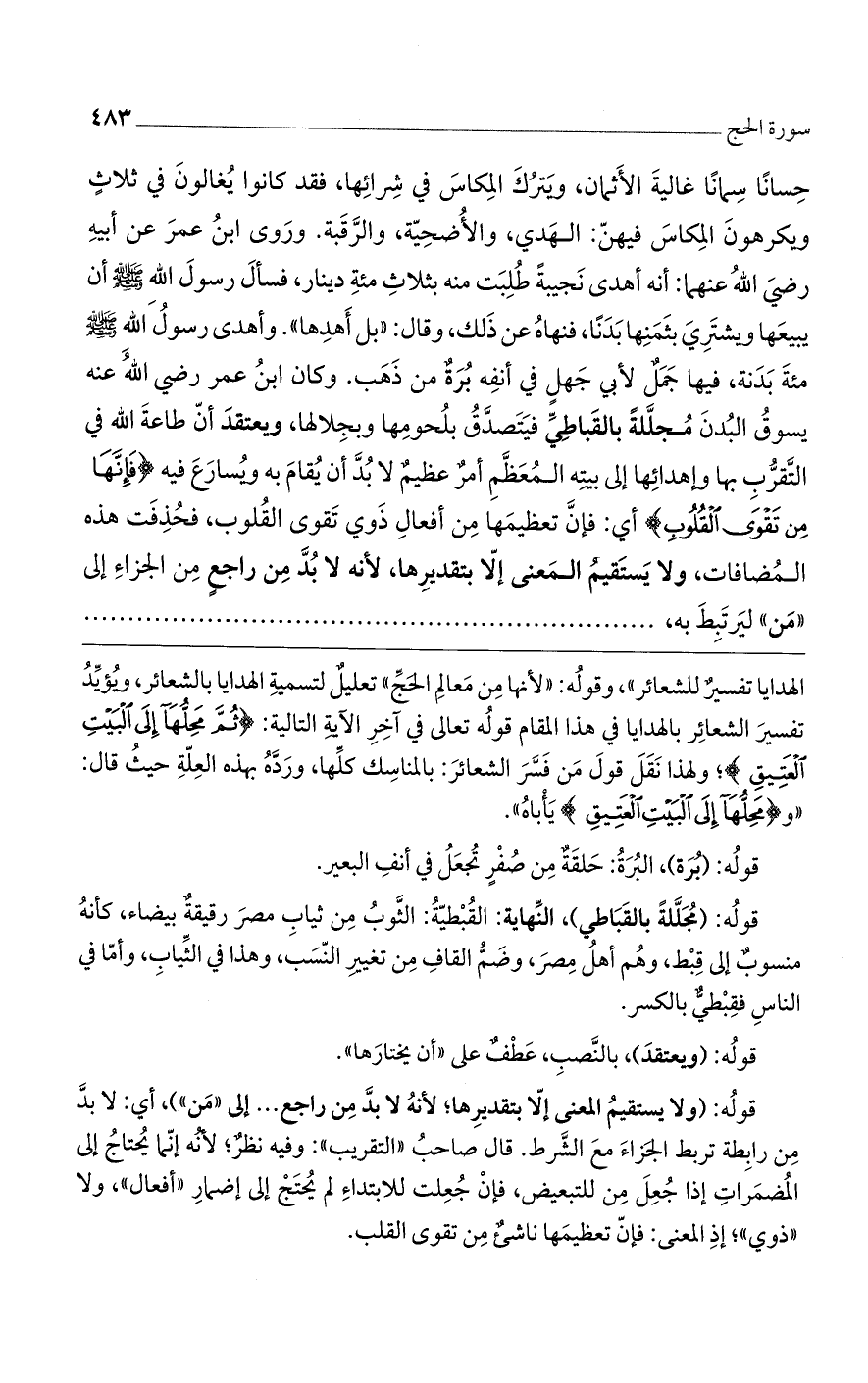 الهدايا تفسيرٌ للشعائر"، وقوله: "لأنها من معالم الحج" تعليلٌ لتسمية الهدايا بالشعائر، ويؤيد تفسير الشعائر بالهدايا في هذا المقام قوله تعالى في آخر الآية التالية: (ثُمَّ مَحِلُّهَا إِلَى الْبَيْتِ الْعَتِيقِ)؛ ولهذا نقل قول من فسر الشعائر: بالمناسك كلها، وردهُ بهذه العلة حيثُ قال: "و (ثُمَّ مَحِلُّهَا إِلَى الْبَيْتِ الْعَتِيقِ) يأباه".
