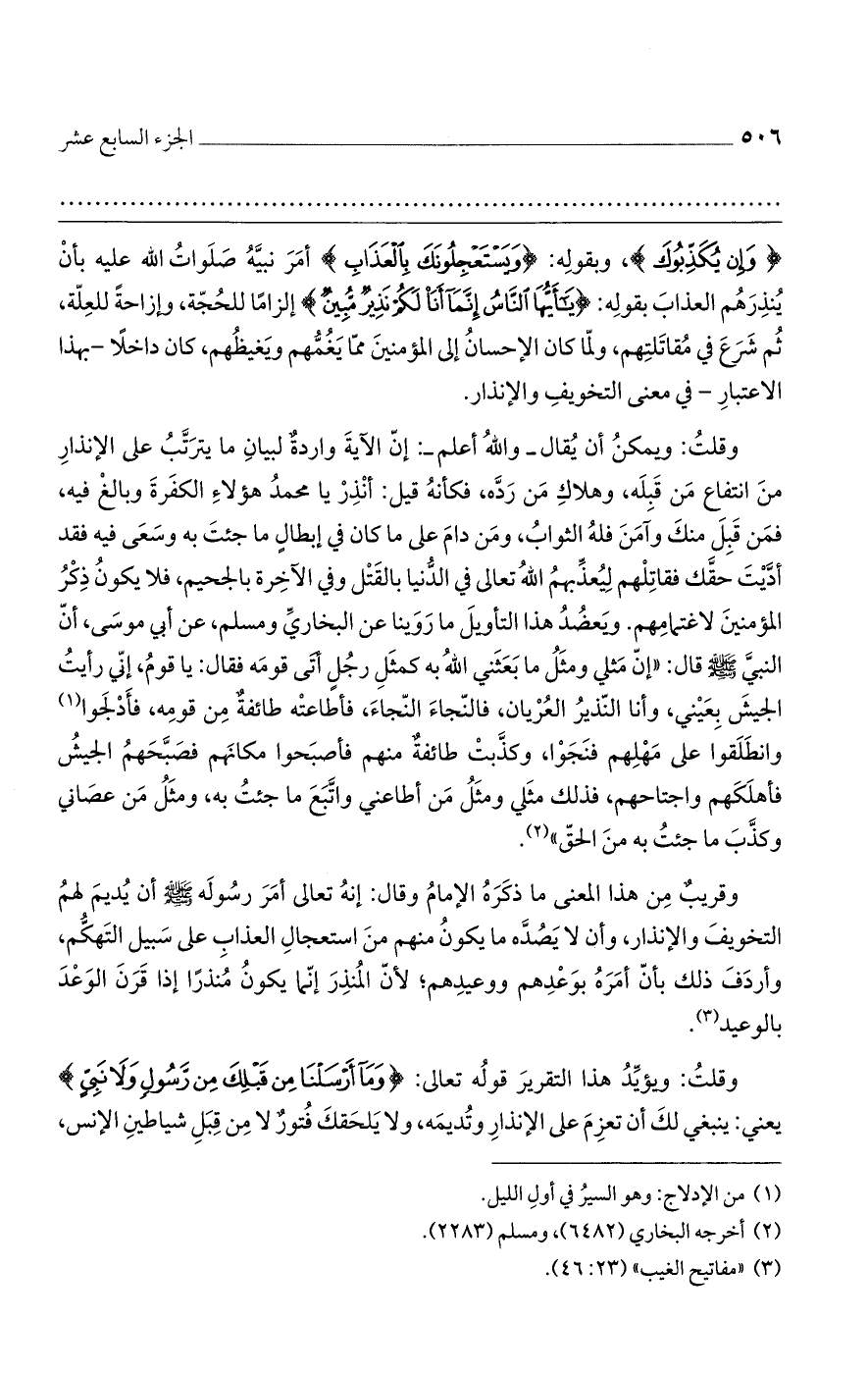 (وَإِنْ يُكَذِّبُوكَ)، وبقوله: (وَيَسْتَعْجِلُونَكَ بِالْعَذَابِ) أمر نبيه صلواتُ الله عليه بأنْ يُنذرهم العذاب بقوله: (يَا أَيُّهَا النَّاسُ إِنَّمَا أَنَا لَكُمْ نَذِيرٌ مُبِينٌ) إلزاماً للحجة، وإزاحةً للعلة، ثُم شرع في مقاتلتهم، ولما كان الإحسان إلى المؤمنين مما يغمهم ويغيظهم، كان داخلاً - بهذا الاعتبار - في معنى التخويف والإنذار.