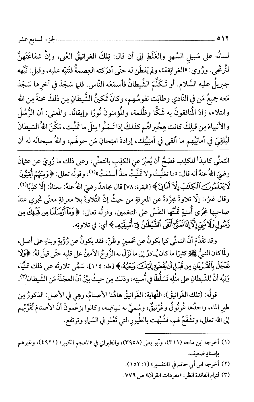 قوله: (تلك الغرانيقُ)، النهاية: الغرانيقُ هاهنا الأصنام، وهي في الأصل: الذكور من طير الماء، واحدها غرنوقٌ وغرنيقٌ، وسمي به لبياضه، وكانوا يزعمون أن الأصنام تقربهم إلى الله تعالى، وتشفع لهم، فشبهت بالطيور التي تعلو في السماء وترتفع.