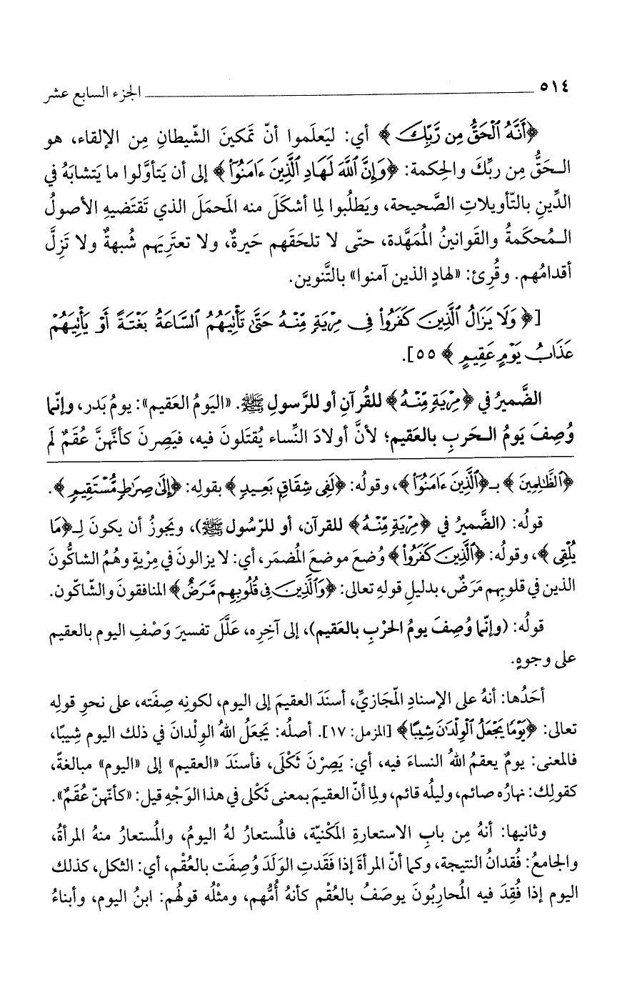 الضمير في (مِرْيَةٍ مِنْهُ) للقرآن أو الرسول صلى الله عليه وسلم. "اليوم العقيم": يوم بدر، وإنما وصف يوم الحرب بالعقيم لأنّ أولاد النساء يقتلون فيه، فيصرن كأنهن عقم لم