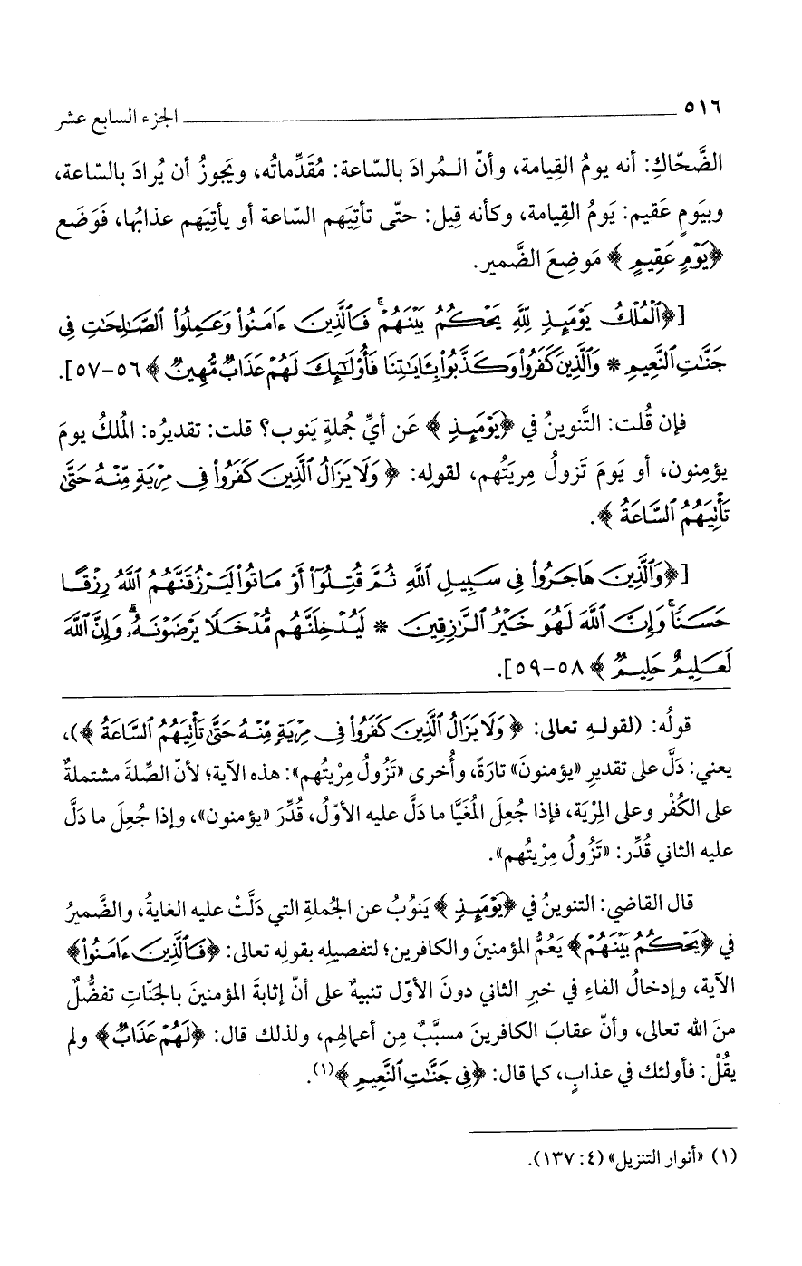 قال القاضي: التنوين في (يَوْمَئِذٍ) ينوبُ عن الجملة التي دلت عليه الغاية، والضميرُ في (يَحْكُمَ بَيْنَهُمْ) يعُمُّ المؤمنين والكافرين؛ لتفصيله بقوله تعالى: (فَالَّذِينَ آمَنُوا) الآية، وإدخالُ الفاء في خبر الثاني دون الأول تنبيهٌ على أن إثابة المؤمنين بالجنات تفضلٌ من الله تعالى، وأن عقاب الكافرين مسببٌ من أعمالهم، ولذلك قال: (لَهُمْ عَذَابٌ) ولم يقل: فأولئك في عذابٍ، كما قال: (فِي جَنَّاتِ النَّعِيمِ).