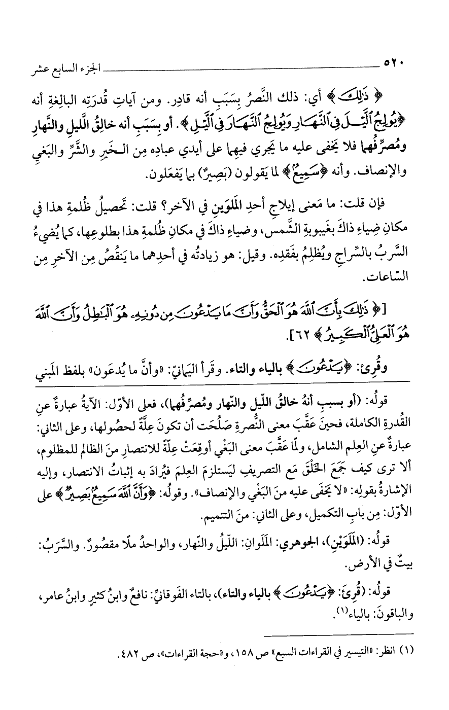 قوله: (قرئ: (يَدْعُونَ) بالياء والتاء)، بالتاء الفوقاني: نافعٌ وابن كثيرٍ وابن عامر، والباقون: بالياء.