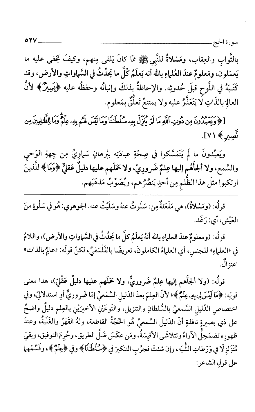 قوله: (ولا ألجأهم غليها علمٌ ضروريٌ، ولا حملهم عليها دليلٌ عقلي)، هذا معنى قوله: (مَا لَيْسَ لِي بِهِ عِلْمٌ)؛ لأن العلم بعد الدليل السمعي إما ضروريٌّ أو استدلالي، وفي اختصاص الدليل السمعي بالسلطان والتنزيل، والنوعين الأخيرين بالعلم دليلٌ واضحٌ على ذي بصيرةٍ نافذةٍ أن الدليل السمعيَّ هو الحجةُ القاطعة، وله القهر والغلبةُ، وعند ظهوره تضمحلُّ الآراءُ وتتلاشى الأقيسةُ، ومن عكس ضل الطريق، وحُرم التوفيق، وبقي متزلزلاً في ورطات الشُّبَه، وإن شئت فجربِ التنكير في (سُلْطَاناً) وفي (عِلْمٌ)، وقسمهما على قول الشاعر: