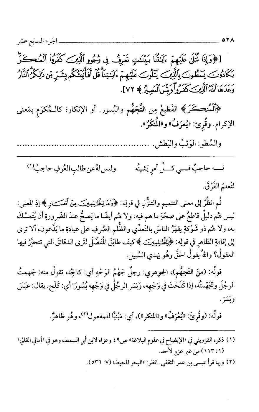 قوله: (وقرئ: "يُعرَفُ" و"المنكر")، أي: مبنياًّ للمفعول، وهو ظاهرٌ.