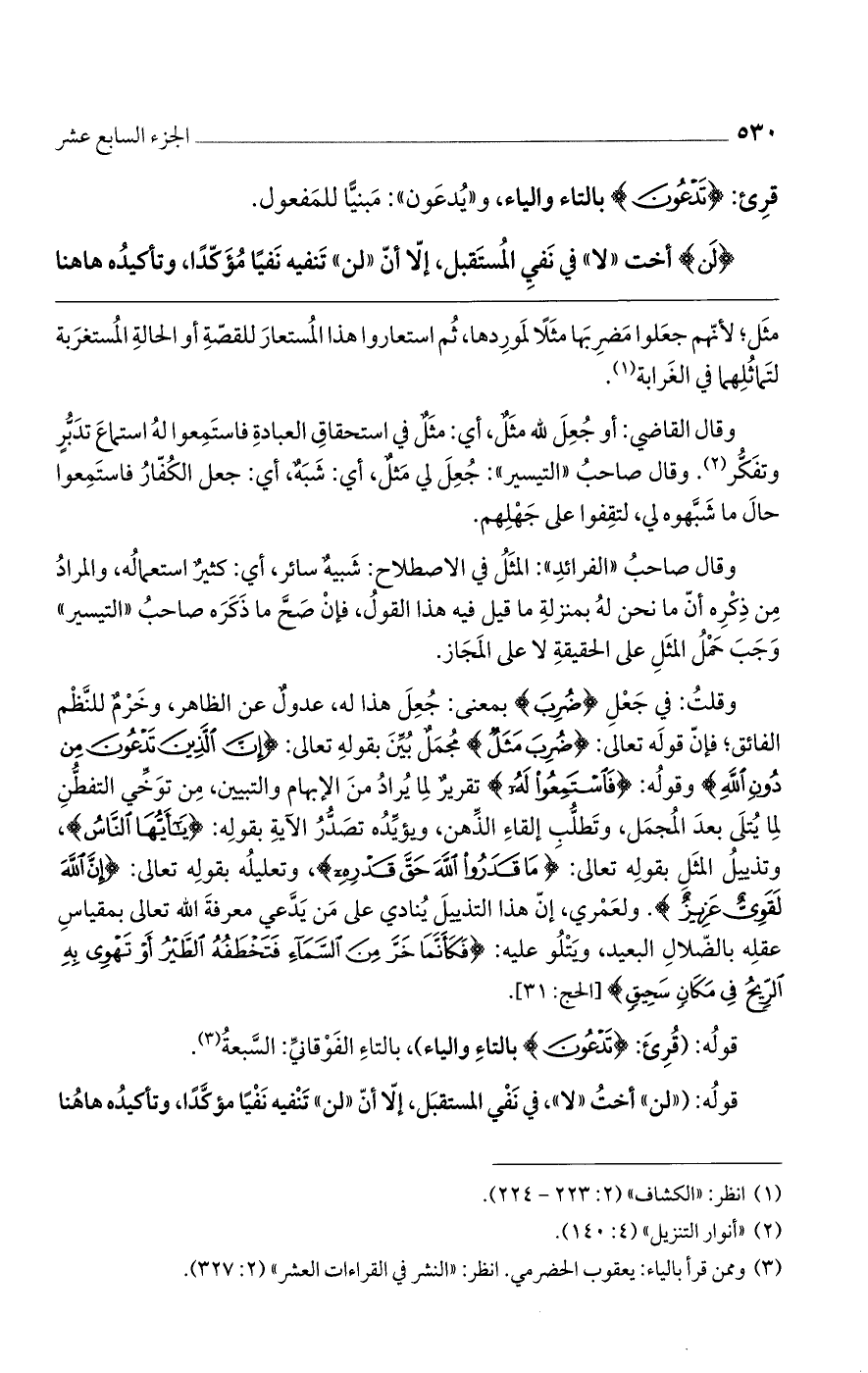 وقلتُ: في جعل (ضُرِبَ) بمعنى: جُعِل هذا له، عدولٌ عن الظاهر، وخرمٌ للنظم الفائق؛ فإن قوله تعالى: (ضُرِبَ مَثَلٌ) مُجملٌ بُيِّنَ بقوله تعالى: (إِنَّ الَّذِينَ تَدْعُونَ مِن دُونِ اللَّهِ) وقوله: (فَاسْتَمِعُوا لَهُ) تقريرٌ لما يُراد من الإبهام والتبيين، من توخى التفطن لما يُتلى بعد المجمل، وتطلب إلقاء الذهن، ويؤيده تصدرُ الآية بقوله: (يَا أَيُّهَا النَّاسُ)، وتذييل المثل بقوله تعالى: (مَا قَدَرُوا اللَّهَ حَقَّ قَدْرِهِ)، وتعليله بقوله تعالى: (إِنَّ اللَّهَ لَقَوِيٌّ عَزِيزٌ). ولعمري، إن هذا التذييل يُنادي على من يدعي معرفة الله تعالى بمقياس عقله بالضلال البعيد، ويتلُو عليه: (فَكَأَنَّمَا خَرَّ مِنْ السَّمَاءِ فَتَخْطَفُهُ الطَّيْرُ أَوْ تَهْوِي بِهِ الرِّيحُ فِي مَكَانٍ سَحِيقٍ) [الحج: 31].
