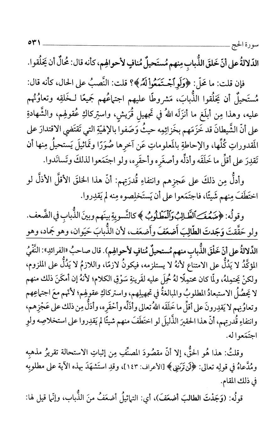 الدلالة على أن خلقَ الذباب منهم مستحيلٌ منافٍ لأحوالهم). قال صاحب "الفرائد": النفيُ المؤكدُ لا يدل على الامتناع لأنه لا يستلزمه، فيكون لازماً، واللازم لا يدل على الملزوم، ولكن يحتمله، ولما كان محتملاً له حُمل عليه لقرينة سوق الكلام؛ لأنه إن أمكن ذلك منهم لا يحصلُ الاستبعادُ المطلوبُ والمبالغةُ في تجهيلهم، واستركاك عقولهم؛ لأنهم مع اجتماعهم وتعاونهم لا يقدرون على أقلِّ ما خلقه الله تعالى وأذله وأحقره، وأدل من ذلك على عجزهم، وانتفاء قُدرتهم، أن هذا الحقير الذليل لو اختطف منهم شيئاً لم يقدروا على استخلاصه ولو اجتمعوا له.