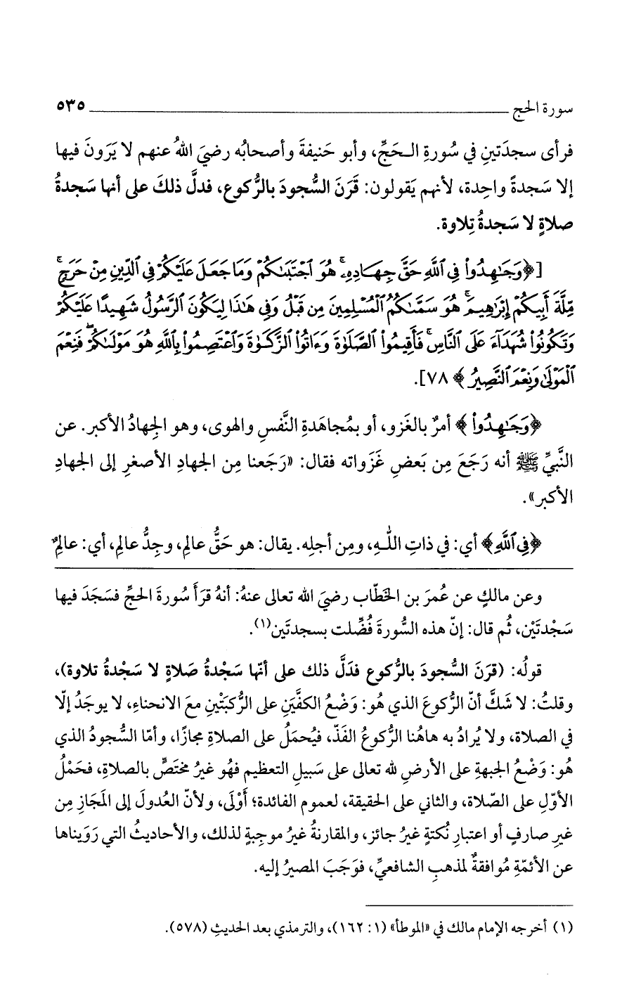 وعن مالك عن عمر بن الخطاب رضي الله تعالى عنه: أنه قرأ سورة الحج فسجد فيها سجدتين، ثم قال: إن هذه السورة فُضِّلت بسجدتين.