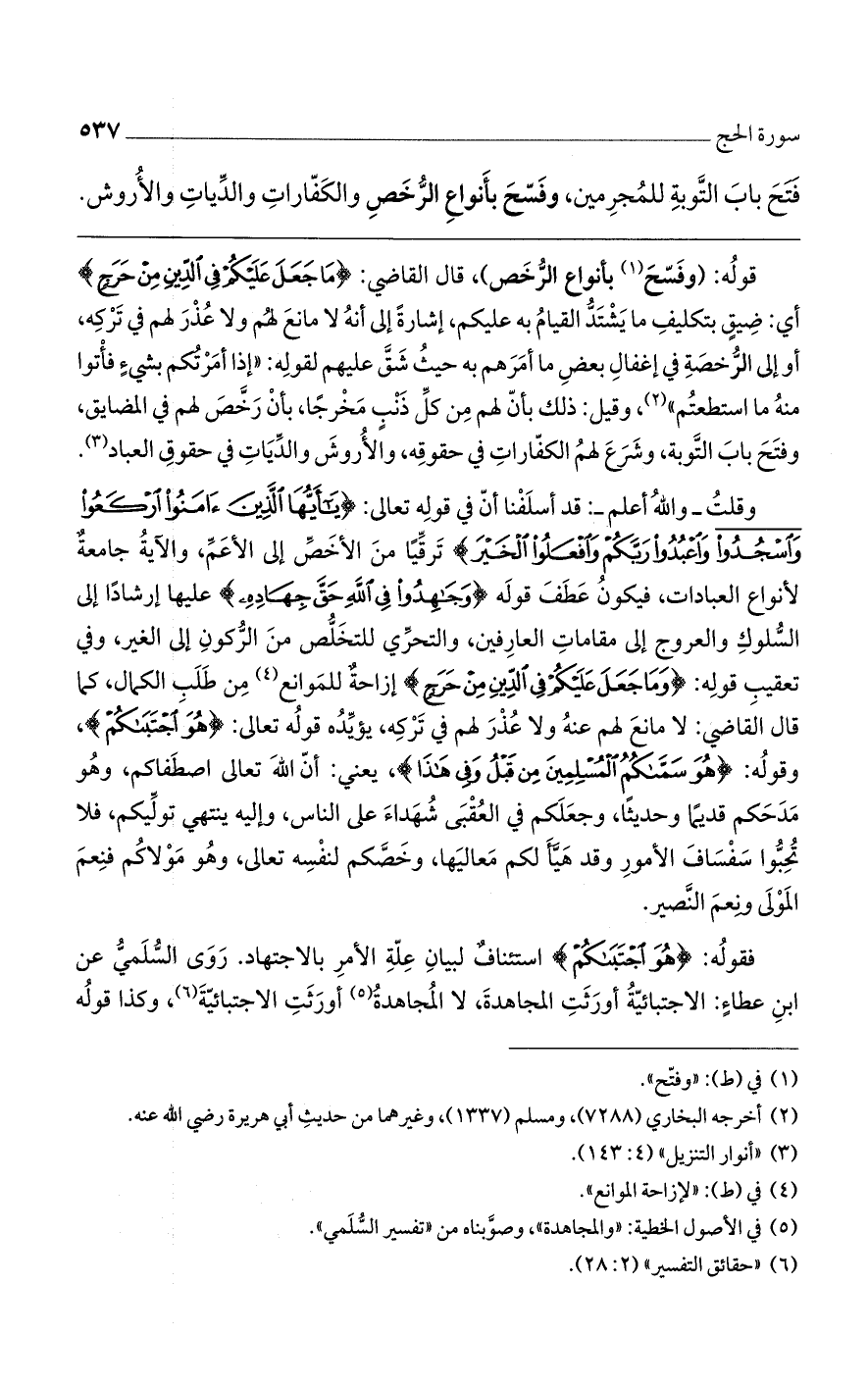 وقلت- والله أعلم-: قد أسلفنا أن في قوله تعالى: (يَا أَيُّهَا الَّذِينَ آمَنُوا ارْكَعُوا وَاسْجُدُوا وَاعْبُدُوا رَبَّكُمْ وَافْعَلُوا الْخَيْرَ) ترقياً من الأخص إلى الأعم، والآية جامعةٌ لأنواع العبادات، فيكونُ عطف قوله: (وَجَاهِدُوا فِي اللَّهِ حَقَّ جِهَادِهِ) عليها إرشاداً إلى السلوك والعروج إلى مقامات العارفين، والتحري للتخلص من الركون إلى الغير، وفي تعقيب قوله: (وَمَا جَعَلَ عَلَيْكُمْ فِي الدِّينِ مِنْ حَرَجٍ) إزاحةٌ للموانع من طلب الكمال، كما قال القاضي: لا مانع لهم عنه ولا عُذر لهم في تركه، يؤيده قوله تعالى: (هُوَ اجْتَبَاكُمْ)، وقوله: (هُوَ سَمَّاكُمْ الْمُسْلِمينَ مِنْ قَبْلُ وَفِي هَذَا)، يعني: أن الله تعالى اصطفاكم، وهو مدحكم قديماً وحديثاً، وجعلكم في العقبى شهداء على الناس، وإليه ينتهي توليكم، فلا تحبوا سفساف الأمور وقد هيأ لكم معاليها، وخصكم لنفسه تعالى، وهو مولاكم فنعم المولى ونعم النصير.