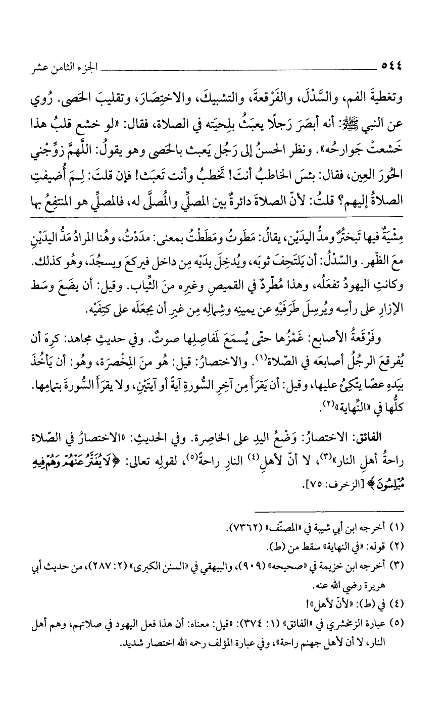 وتغطية الفم، والسدل، والفرقعة، والتشبيك، والاختصار، وتقليب الحصى. روى عن النبي صلى الله عليه وسلم أنه أبصر رجلا يعبث بلحيته في الصلاة فقال «لو خشع قلبه خشعت جوارحه «2»» ونظر الحسن إلى رجل يعبث بالحصى وهو يقول: اللهمّ زوجني الحور العين، فقال: بئس الخاطب أنت! تخطب وأنت تعبث. فإن قلت: لم أضيفت الصلاة إليهم؟ قلت: لأنّ الصلاة دائرة بين المصلى والمصلى له، فالمصلى هو المنتفع بها