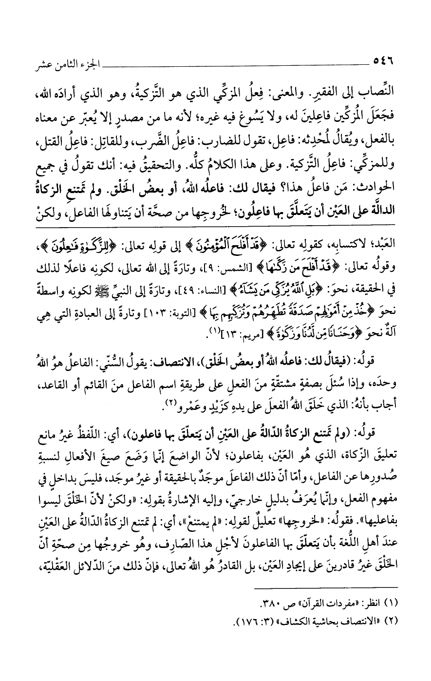 العبد؛ لاكتسابه، كقوله تعالى: (قَدْ أَفْلَحَ الْمُؤْمِنُونَ) إلى قوله تعالى: (لِلزَّكَاةِ فَاعِلُونَ)، وقوله تعالى: (قَدْ أَفْلَحَ مَنْ زَكَّاهَا) [الشمس: 9]، وتارةً إلى الله تعالى، لكونه فاعلاً لذلك في الحقيقة، نحو: (بَلْ اللَّهُ يُزَكِّي مَنْ يَشَاءُ) [النساء: 49]، وتارةً إلى النبي صلى الله عليه وسلم لكونه واسطةً نحو (خُذْ مِنْ أَمْوَالِهِمْ صَدَقَةً تُطَهِّرُهُمْ وَتُزَكِّيهِمْ بِهَا) [التوبة: 103] وتارةً إلى العباد التي هي آلة نحو (وَحَنَانَاً مِنْ لَدُنَّا وَزَكَاةً) [مريم: 13].