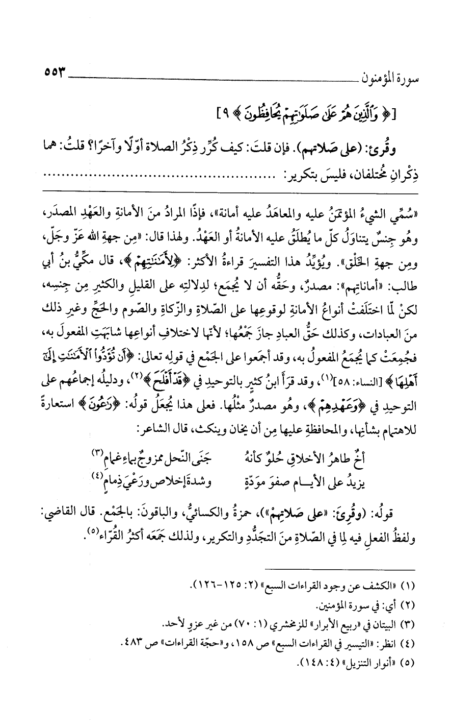 قوله: (وقرئ: "على صلاتهم")، حمزة والكسائي، والباقون: بالجمع. قال القاضي: ولفظُ الفعل فيه لما في الصلاة من التجدد والتكرير، ولذلك جمعه أكثر القراء.