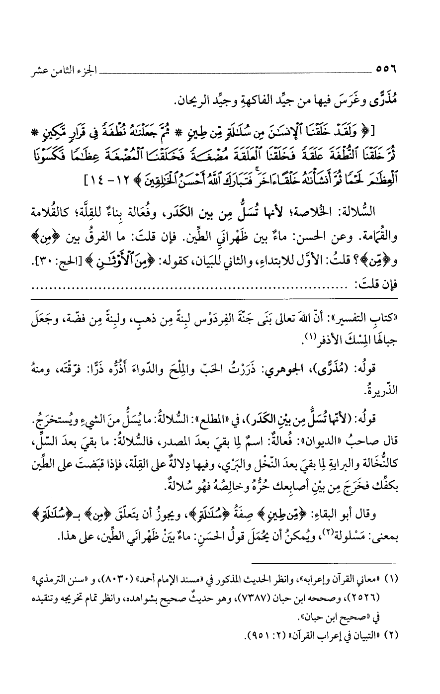 وقال أبو البقاء: (مِنْ طِينٍ) صفة (سُلالَةٍ)، ويجوز أن يتعلق (مِنْ) بـ (سُلالَةٍ) بمعنى: مسلولة، ويمكن أن يُحمل قول الحسن: ماءٌ بين ظهراني الطين، على هذا.