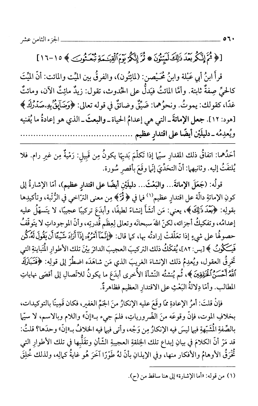 قوله: (جعل الإماتة .. والبعث ... دليلين أيضاً على اقتدار عظيم)، أما الإشارةُ إلى كون الإماتة دالة على اقتدار عظيم فما في (ثُمَّ) من معنى التراخي في الرتبة، وتأكيدها بقوله: (بَعْدِ ذَلِكَ)، يعني: من أنشأ إنشاءً لطيفاً، وأبدع تركيباً عجيباً، لا يتسهل عليه إعدامه، وتفكيكُ أجزائه، لكن الله سبحانه وتعالى لعظم قدرته، وأن الموجودات لا يتوقف حصولها على شيء إذا تعلقت إرادته بها، كما قال: (إِنَّمَا أَمْرُهُ إِذَا أَرَادَ شَيْئاً أَنْ يَقُولَ لَهُ كُنْ فَيَكُونُ) [يس: 82]، يفكك ذلك التركيب العجيب الدائر بين تلك الأطوار المتباينة التي تخرق العقول، ويعدم ذلك الإنشاء الغريب الذي من شاهده اضطر إلى قوله: (فَتَبَارَكَ اللَّهُ أَحْسَنُ الْخَالِقِينَ)، ثم ينشئه النشأة الأخرى أبدع ما يكون للاتصال إلى أقصى نهايات المطالب وأما دلالة البعث على الاقتدار العظيم فظاهرة.