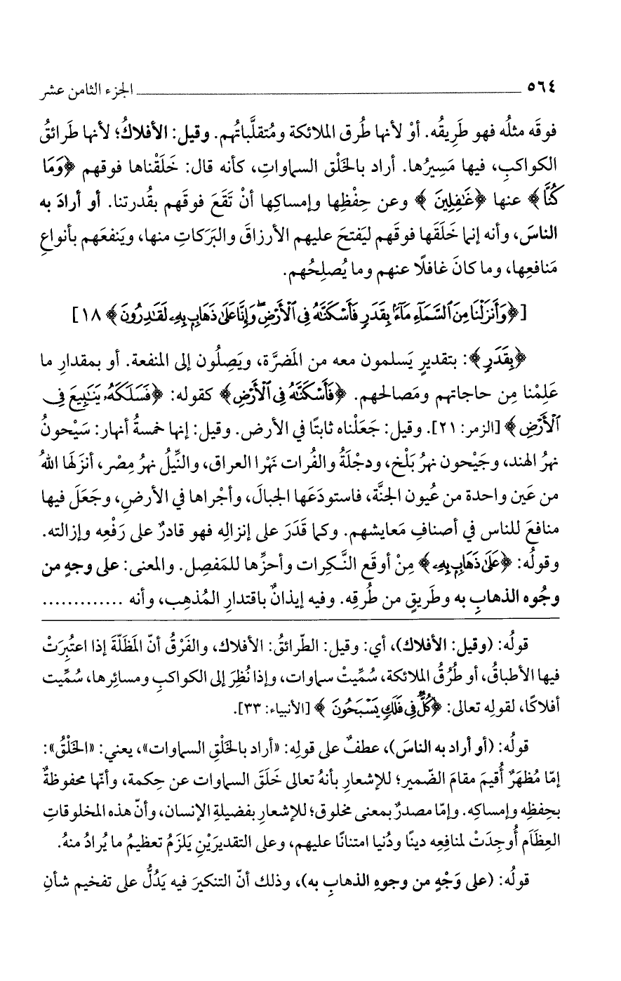 (بِقَدَرٍ) بتقدير يسلمون معه من المضرة، ويصلون إلى المنفعة. أو بمقدار ما علمناه من حاجاتهم ومصالحهم. (فَأَسْكَنَّاهُ فِي الْأَرْضِ) كقوله (فَسَلَكَهُ يَنابِيعَ فِي الْأَرْضِ)] الزمر: 21 [وقيل: جعلناه ثابتا في الأرض. وقيل: إنها خمسة أنهار: سيحون نهر الهند. وجيحون: نهر بلخ، ودجلة والفرات: نهرا العراق. والنيل: نهر مصر، أنزلها الله من عين واحدة من عيون الجنة، فاستودعها الجبال، وأجراها في الأرض، وجعل فيها منافع للناس في أصناف معايشهم. وكما قدر على إنزاله فهو قادر على رفعه وإزالته. وقوله (عَلى ذَهابٍ بِهِ) من أوقع النكرات وأحزها للمفصل. والمعنى: على وجه من وجوه الذهاب به وطريق من طرقه. وفيه إيذان باقتدار المذهب، وأنه