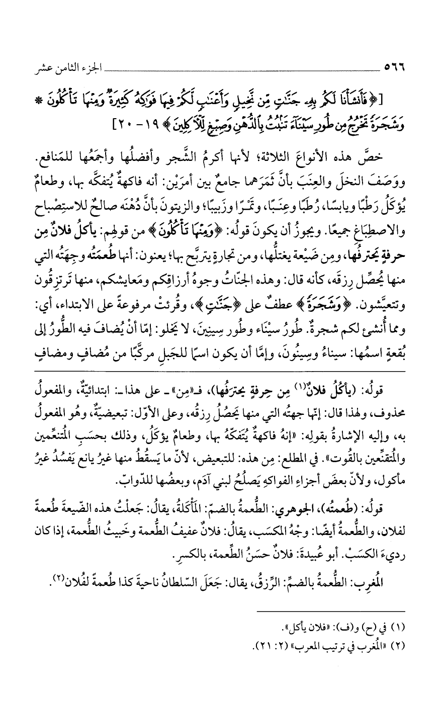 قوله: (يأكل فلانٌ من حرفةٍ يحترفُها)، فـ"مِن" - على هذا-: ابتدائيةٌ، والمفعولُ محذوف، ولهذا قال: إنها جهتُه التي منها يحصل رزقه، وعلى الأول: تبعيضيةٌ، وهو المفعولُ به، وإليه الإشارةُ بقوله: "إنه فاكهةٌ يتفكه بها، وطعامٌ يؤكل، وذلك بحسب المتنعمين والمتقنعين بالقوت". في المطلع: من هذه: للتبعيض، لأن ما يسقطُ منها غير يانع يفسد غيرُ مأكول، ولأن بعض أجزاء الفواكه يصلح لبني آدم، وبعضها للداوب.