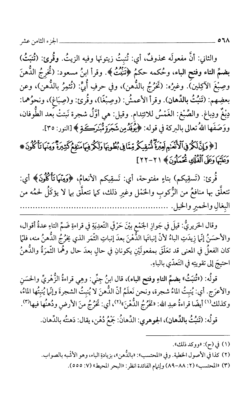 قوله: ("تُنبتُ" بضم التاءِ وفتح الباء)، قال ابنُ جِنِّي: وهي قراءةُ الزُّهريِّ والحسنِ والأعرج. أي: يُنبتُ الماءُ شجرة، ونحن نعلمُ أن الدُّهنَ لا ينبتُ الشجرة وإنما ينبتها الماءُ، وكذلك أيضاً قراءةُ عبد الله: "تخرجُ الدُّهنَ"، أي: تخرجُ من الأرضِ ودهنُها فيها.